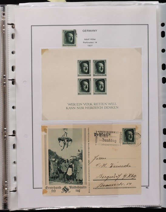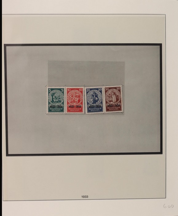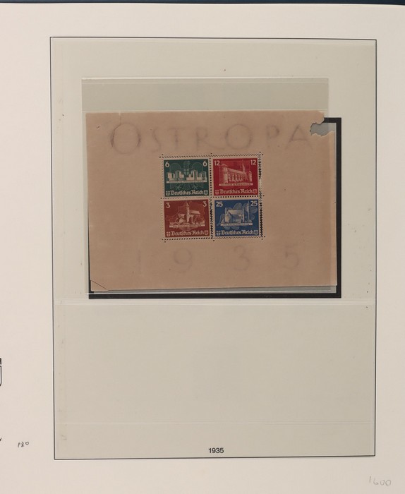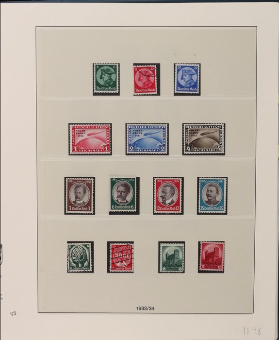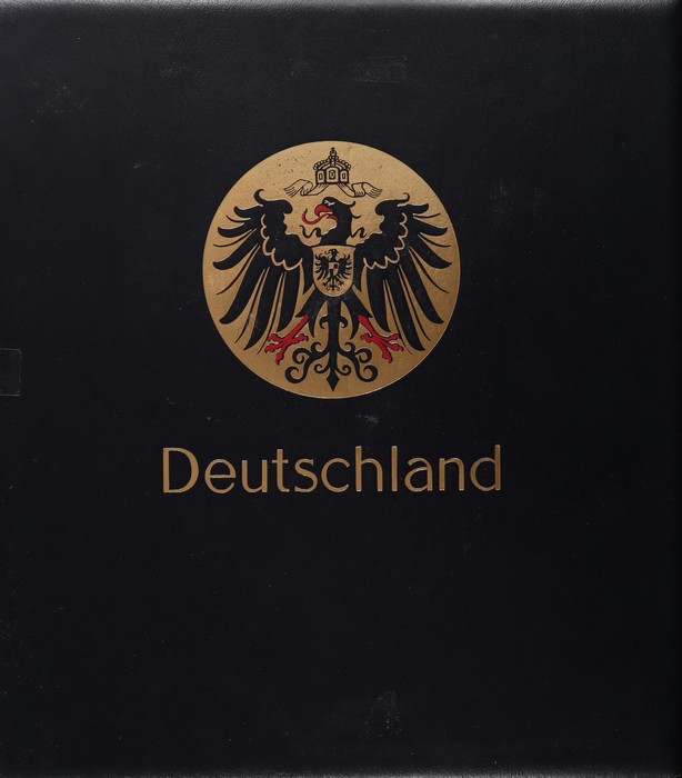 333 imageGermany: 1872-1945 collection in 2 VGC Lindner hingeless albums. 1872 Embossed Eagles range (30, SG cat £3600) inc 5M/UN, & 9/9k surch U (£750), 1875-1900 Arms, 1900 Reichspost to 3Mk, later to 5Mk inc new colours & wmks, then extensive defins near comp, Airmails, Officials, Inflation surch, commems & Charities, 1930 Iposta M/Sheet VF MLH (£700), 1931 Zeppelin Polar flight opt set M (£1100). 1933 onwards Reich issues inc Wagner set (£450), 1923 Charity Anniv opt singles (set of 4 £600), 1934 Workers (£120), 1935 Ostropa M/S in typical condition with stamps separated & margin damaged, 1936 Olympics M/S (£130), Hitler M/S (3, £180) & 1937 Brown Ribbon M/S (£90), 1939 Nurburgring opt set (£85), 1939 opt Danzig set (£85), Officials etc. Very near comp. F-VF M/MNH/U. All M counted as hinged, but MNH sighted. SG cat almost £13,000 = A$26,000. Valuable collection. (1050 + 9 M/S). (P) (Image1) (Image2) (Image3) (Image4) (Image5) (Image6) (Image7) (Image8) (Image9) (Image10) (Image11) (Image12) (Image13)
