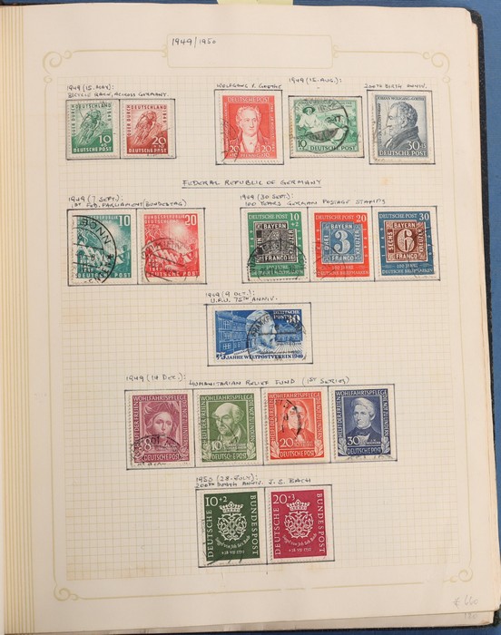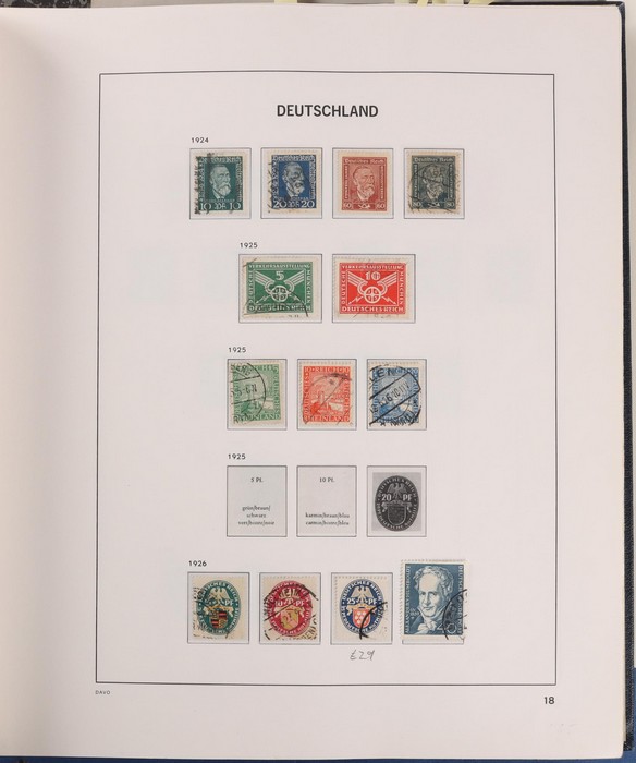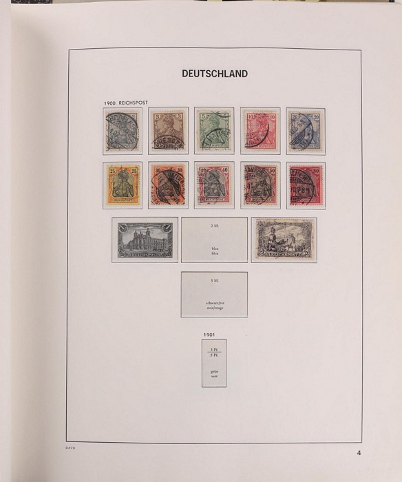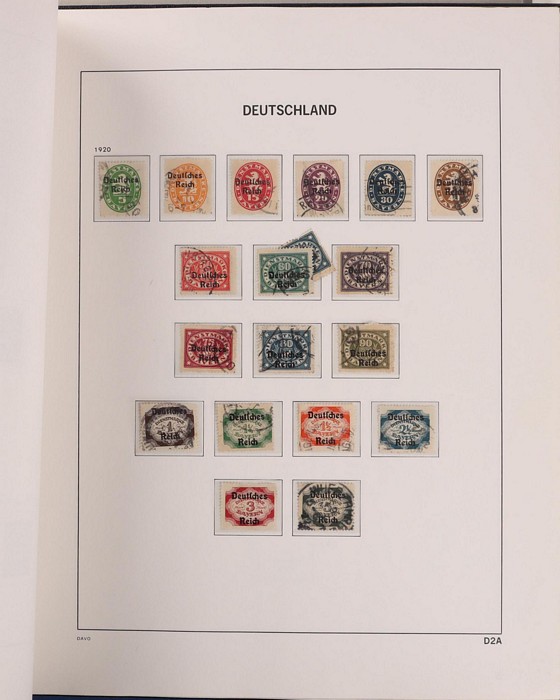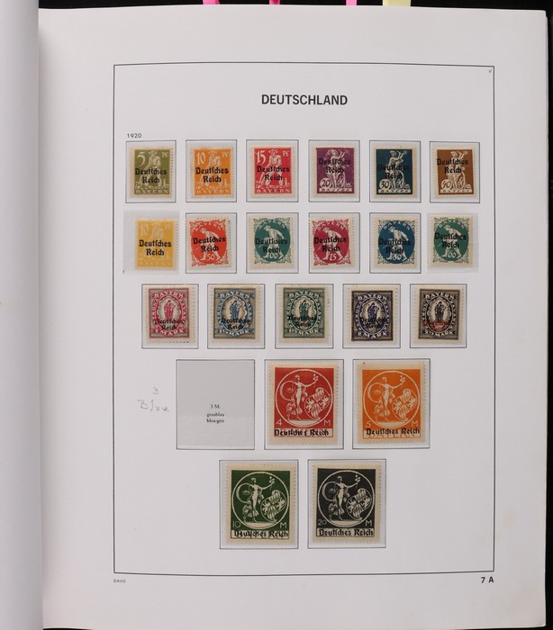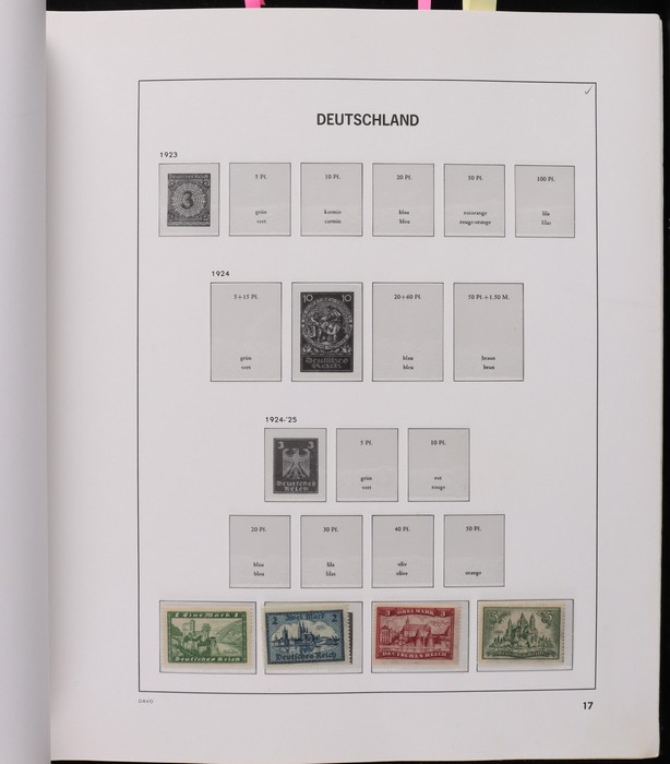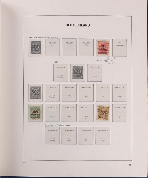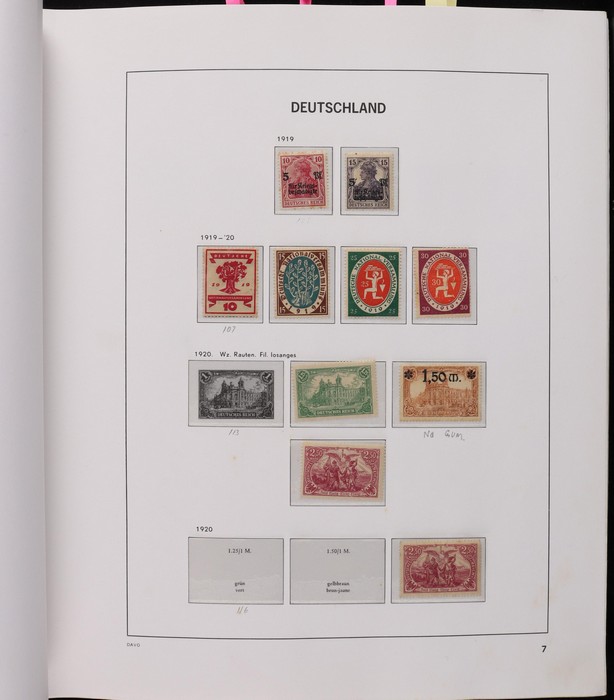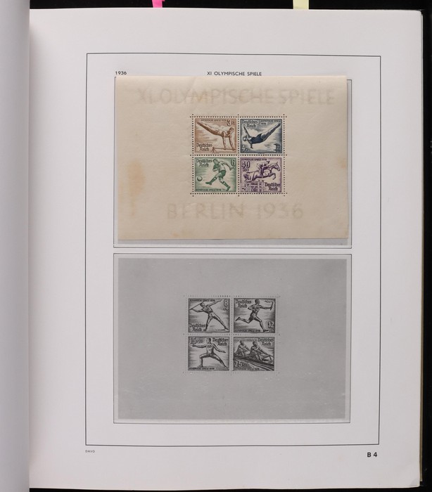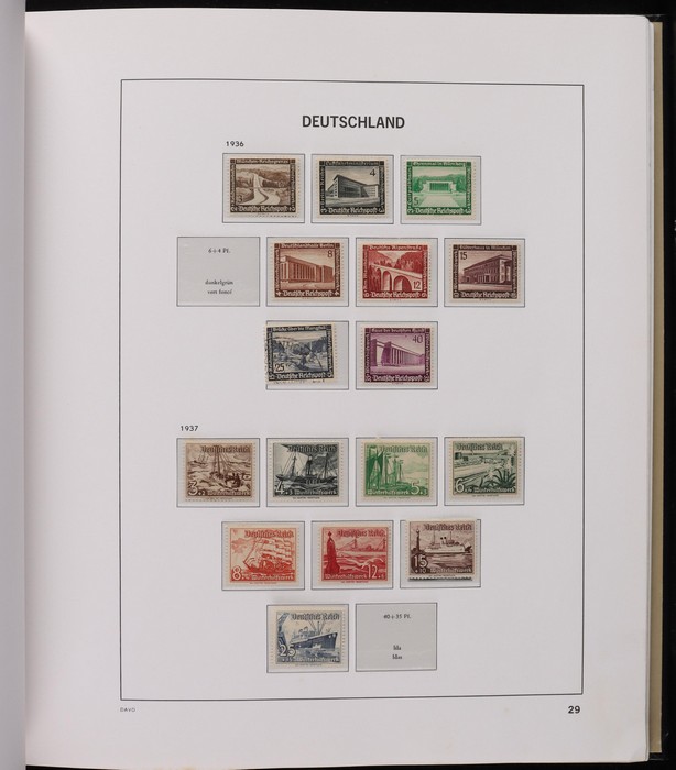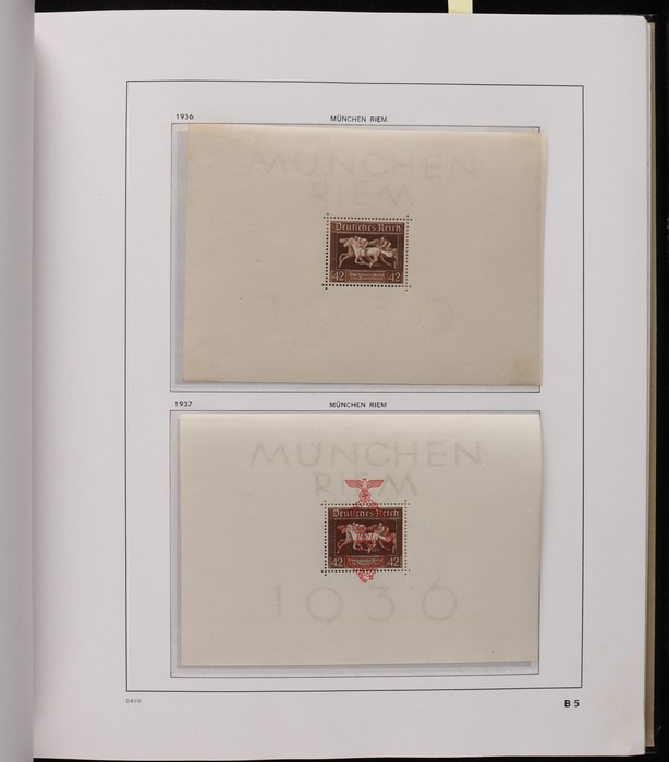 336 imageGermany: Collections in 3 albums- 1st volume to 1994 in Davo illustrated album, with 1870s Small Eagles (6), Large Eagles (9) to 3kr, 1900 Reich Post to 3M, 1902 Deutsches Reich to 5M, all G-F/VFU. Then mostly M inc 1920 Bavaria opt Deutches Reich to 20Mk (ex 3Mk), 1924-27 Castles set, 1927 ILO opt set, 1933 Reich stag set, 1933 Welfare 25pf, 1934 Welfare Fund set UN, 1935 Welfare Fund set, 1936 Olympics M/Sheet, 1936 Brown Ribbon M/Sheet, 1937 opt M/Sheet MNH, Belgium 1943 Waffen set, Michel IX/XIV in sheets of 4 hinged in selvedge (cat €600); 2nd album with Berlin 1949-1990 a solid mostly F-VF M-MNH collection inc 1999 Berlin black opts to 5Mk, 1999 UPU set, 1949-54 Building to 5Mk, 1950 Orchestra set M, 1951-53 Bell (all 3 sets), Bell at centre MNH, others M, 1952 Olympics set, 1952-53 Berliners set, 1970 President set, 1975 Industry set, 1985 Famous Women & 1987 Tourist Sights sets MNH. 3rd album with West Germany inc 1951 St Mary's set, 1955-1980 good range MNH inc 1959 Beethoven M/Sheet. Largely F-VF. SG cat £6600 = A$13,000. (2200, 6 M/S) (Image1) (Image2) (Image3) (Image4) (Image5) (Image6) (Image7) (Image8) (Image9) (Image10) (Image11) (Image12) (Image13) (Image14) (Image15) (Image16) (Image17) (Image18) (Image19) (Image20) (Image21) (Image22) (Image23) (Image24) (Image25) (Image26)