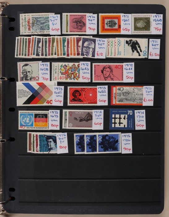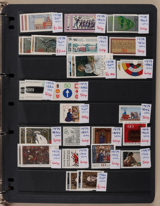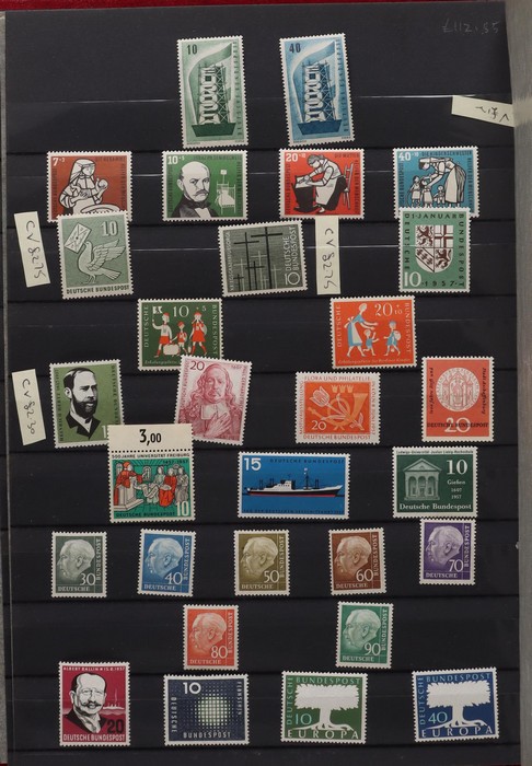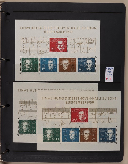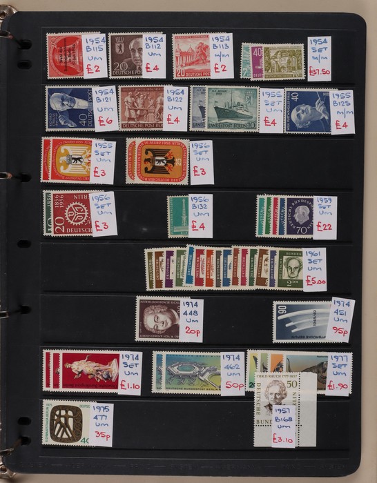 337 imageGermany: Post-WWII UK dealer stock mostly M/MNH with West Germany (500) inc 1949 UPU (2 U, SG cat £120), 1949 Refugee Relief set (£140), 1951 Posthorns inc 15pf, 20pf, 25pf, 40pf, 60pf & 70pf all MNH (£1200+), 1951 Relief MNH (£170), plus 30pf U (£150), 1952 Relief MNH (£150), 1953 Relief U (£120), 1959 Beethoven M/S (7, cat £217) & range to 1980s (total SG cat £6000+). Berlin 1948-80s (140, £6100+) inc 1948 black opt set M (cat £450), red opt set M (£1600), 1949 Buildings (£1000), UPU set M (£950), Goethe MNH (£375), Surch set M (£300), Relief MNH (£425), 1950 Orchestra MNH (£185), 1952 Berliners MNH (£160) & some more. East Germany (250) (cat £970) to 1980s inc 1950 Academy set M (£170) & 1955 M/Sheets (3, £95), plus odds earlier (85) inc Bavaria 1911 blks of 4, 1919 Free state opts top 3 vals from 2 sets U (£245). Also Colonies & POs (50+, £650+). VF fresh MNH M/MNH/U. Total SG cat £14,000 = A$26,000. Marked UK retail £4800 = A$9600 conservatively priced. Excellent stock for resale. (1000, 16 M/S) (P) (Image1) (Image2) (Image3) (Image4) (Image5) (Image6) (Image7) (Image8) (Image9) (Image10) (Image11) (Image12) (Image13) (Image14) (Image15) (Image16) (Image17) (Image18) (Image19) (Image20) (Image21) (Image22) (Image23) (Image24) (Image25) (Image26) (Image27)