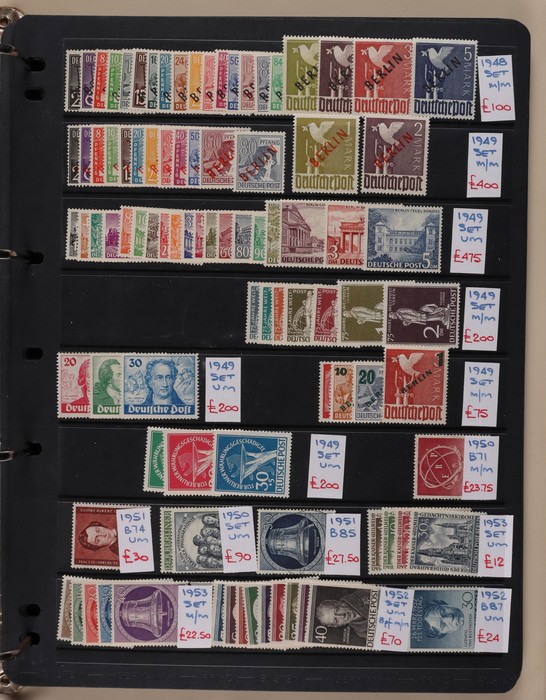 339 imageGermany: 1945-80s collection in 4 albums, on hagners & s/books inc 1945 Allied Occupation issues, 1949 Hanover M/S (cat £450), Berlin 1948 black opts to 2M, 1949 red opts to 1M, 1949 Refugees set, 1951-53 Freedom Bell sets in 3 positions, West Germany to 1980s many comp sets, mostly diff. Mint collection on hagners, East German Mint sets on stockcards. Mainly F-VF M/MNH/U. SG cat £8300 = A$16,000. (2400 + 30 M/S) (Image1) (Image2) (Image3) (Image4) (Image5) (Image6) (Image7) (Image8) (Image9) (Image10) (Image11) (Image12) (Image13) (Image14) (Image15) (Image16) (Image17) (Image18) (Image19) (Image20) (Image21)