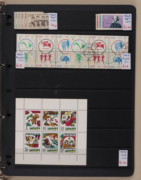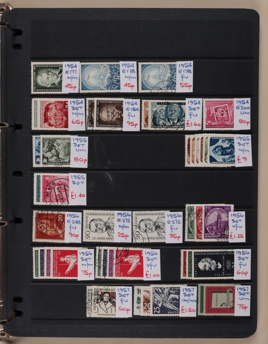 345 imageGermany - East: 1949-80 collection in 2 Davo illustrated albums & a loose leaf album inc 1950 Science comp, 1951 Friendship set to 50pf, 1952 Politicians etc comp set to 84pf, 1953 5 Year Plan no imprint comp to 84pf, 1950 Debria M/S, 1953 Marx M/S (2), 1955 Engels M/S, 1957 National Memorials M/S. Quite comprehensive from early inc many comp sets, all diff, also Soviet Occup 1945-48. Some tropicalisation effecting album & a few earlies would definitely benefit from rehousing. Mainly fresh VFU. SG cat £3500+ = A$7000. (3400, 120 M/S) (Image1) (Image2) (Image3) (Image4) (Image5) (Image6) (Image7) (Image8) (Image9) (Image10) (Image11)