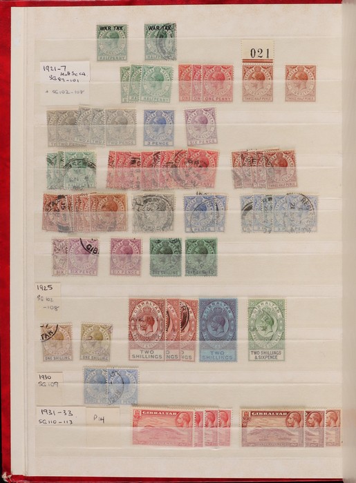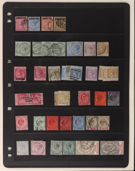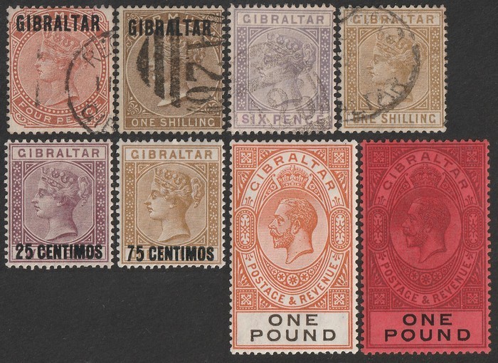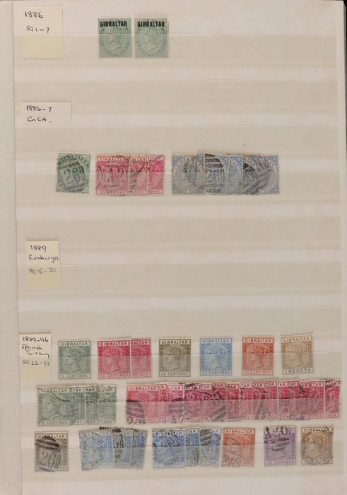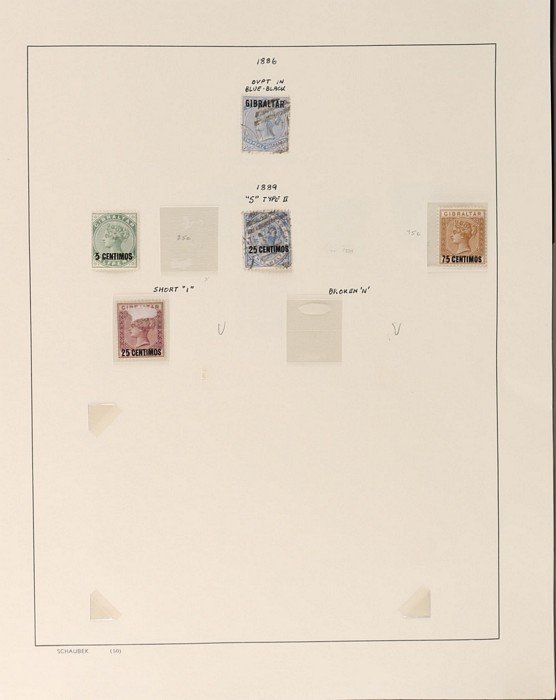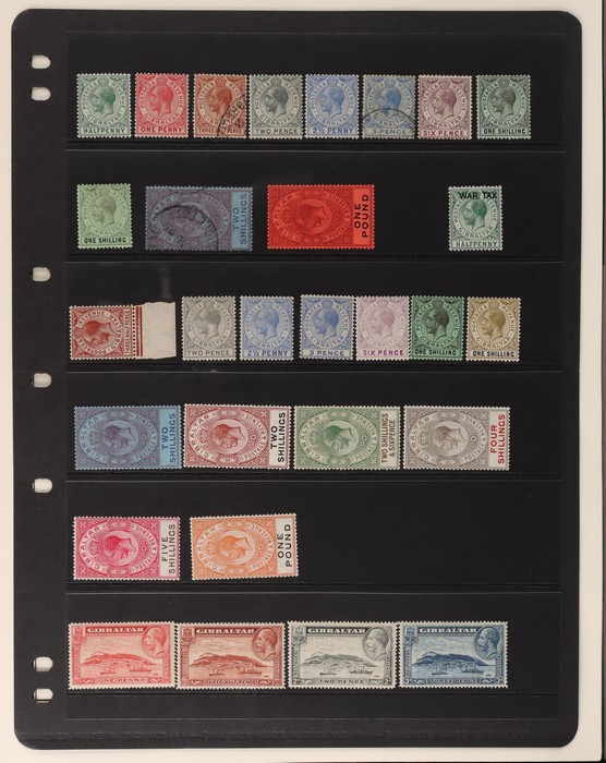 347 imageGibraltar: 1886-1952 collection inc 1886 opt QV Bermuda vals to 1/-. 1886-87 QV vals to 1/-. 1889-96 QV Spanish Currency vals to 1p. 1912-22 KGV vals to £1. 1925-32 KGV vals to £1. 1931 KGV The Rock set. 1938-52 KGVI Pic vals to 10/-. Also some varieties inc 1889 QV 25c on 2d, 'short I' variety & 25c on 2½d, 'short 5' variety. Mostly F-VF M/U. SG cat £1900+ = A$3800. (105) (P) (Image1) (Image2) (Image3) (Image4) (Image5) (Image6)