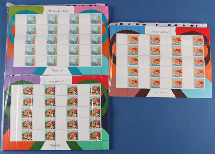 349 imageGibraltar: 2007 Personalised Tab Pics 'You Stamps' in comp sheets of 20. Trio comprising NVI G (local post), Birthday, With Love & Meet Our New Baby with 1500 stamps of ea. 225 sheets, total 45,000. SG cat £1800 = A$3600. FV = £1350 = A$2700. (Image1)