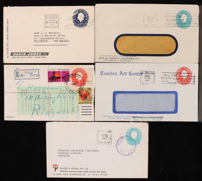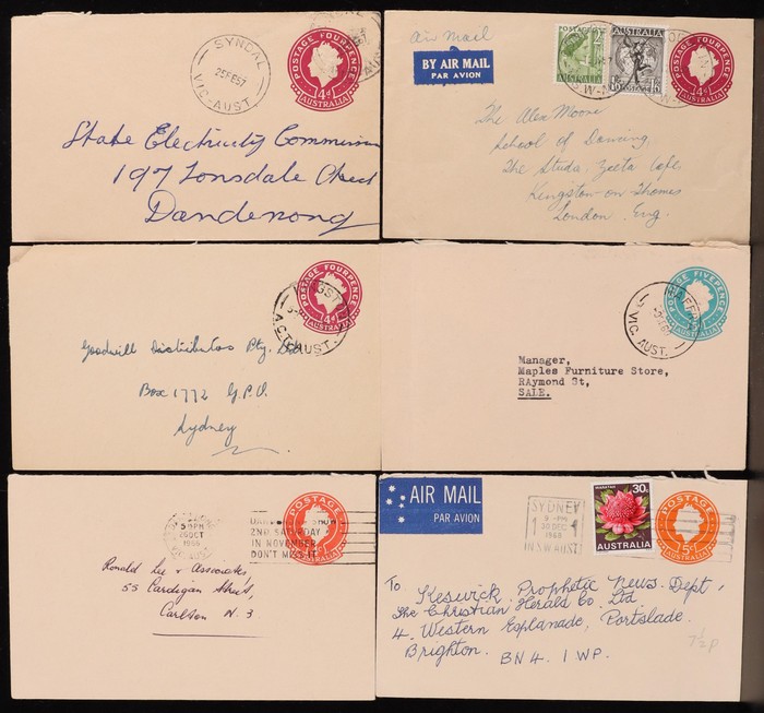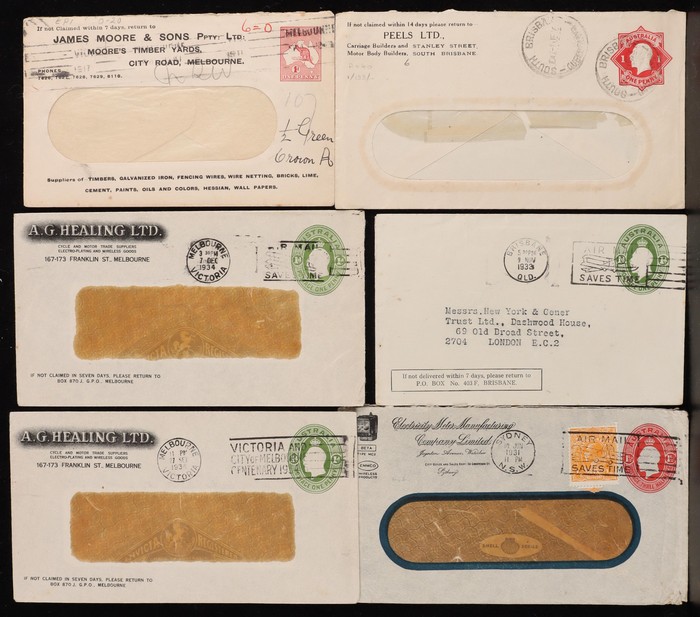 3700 imagePostal Stationery - Envelopes: 1917-60s used collection with PO issues (16) from 1919 KGV 1d red 'star', 1½ red uprated to USA, KGVI 2½d & 3½d, QEII 3½, 4d plum lge & small dies, 5d light blue CTO, 5d red CTO, 4c red (2), 5c orange (2). Then PTPO 1917 use Kangaroo 1d, KGV 'star' 1d red (3), KGV oval 1d green (3), 1½d red, 2d red (2), KGVI 1½d green, 2d red, 2½d red (2), 3½d, QEII 3d green (2), 3½ orange (2), 4d plum (2) & small die, 5d dark blue, light blue (2), 5d red. Then Officials with 1919 use of KGV 1d red with OS dots in die $200, 1950 use! KGV star 1½d red with Postage, OS in die. Also 1919 usage of Victoria QV 1d red OS in die long type uprated KGV ½d. Mostly F-VF U. All diff. ACSC cat $900+. (45). (Image1) (Image2) (Image3) (Image4) (Image5) (Image6) (Image7) (Image8) (Image9) (Image10)
