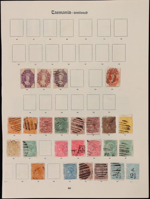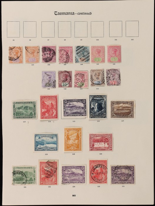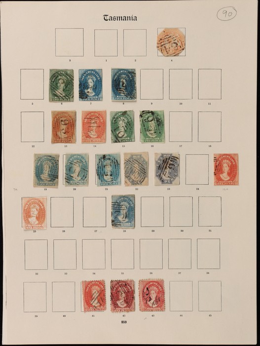 3704 imageTasmania: 1853-1912 collection on old album pgs inc 1853-54 QV Courier 4d. 1855 QV Chalon 2d & 4d (2 shades) wmk Large star. 1857-67 QV Chalon vals to 6d, imperf inc shades. 1863-71 QV Chalon 4d serrated perf 14. 1863-91 QV Chalons to 1/- perf. 1892-99 QV Tablets to 5/-. 1899-1900 Pictorial to 6d M plus later printings. 1880 Platypus Stamp Duty set to 1/-, with postal pmks. Mostly G-VF M/U, mixed in parts as usual. SG cat £2000+ = A$3990. (86) (Image1) (Image2) (Image3) (Image4)