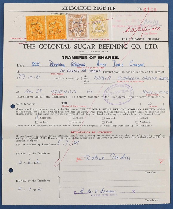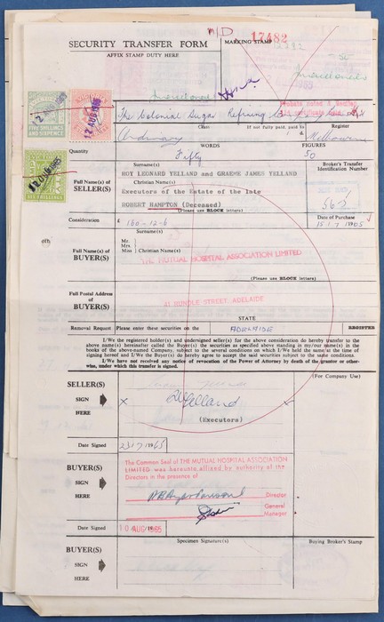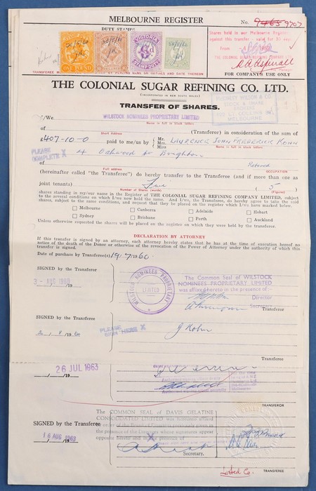 3705 imageVictoria - Revenues: 1960s Colonial Sugar Refinery Co share transfer certificates with a range of vals from 1/6 yellow single franking to £2 blue inc multiple frankings of up to 5 stamps. Approx 200 certificates inc a few with 'Not Chargeable with Stamp Duty' cachets or with decimals attached. (Image1) (Image2) (Image3) (Image4) (Image5) (Image6) (Image7) (Image8) (Image9) (Image10) (Image11) (Image12) (Image13) (Image14) (Image15) (Image16) (Image17) (Image18) (Image19)