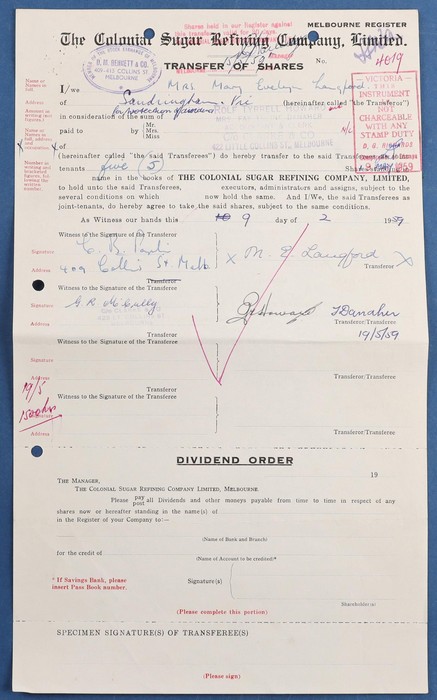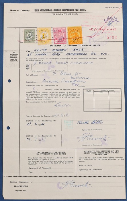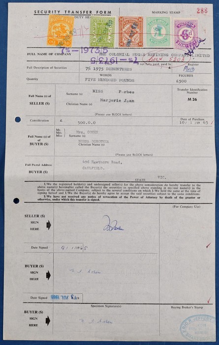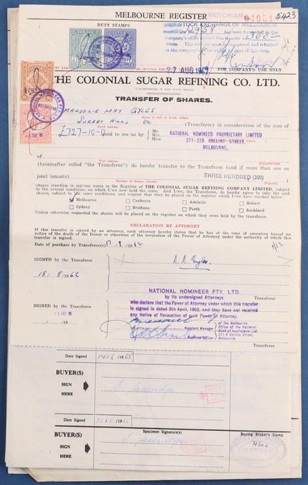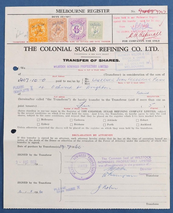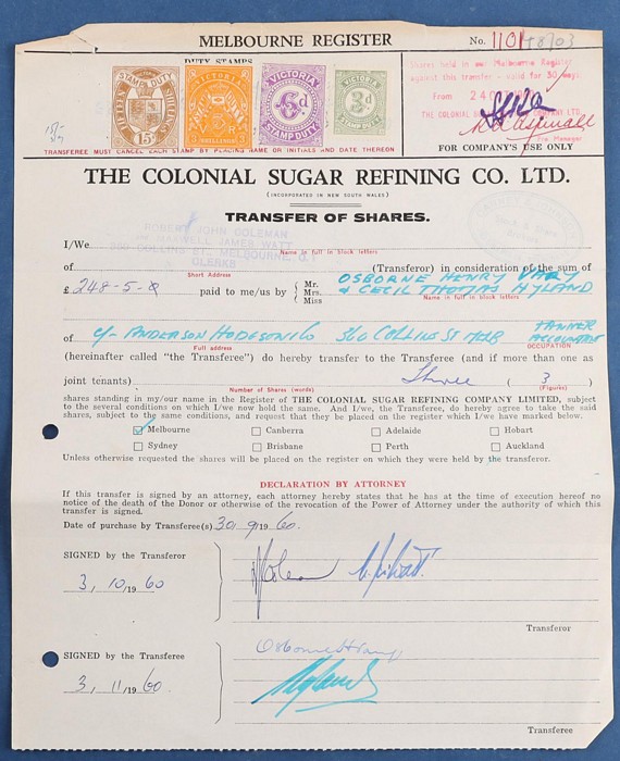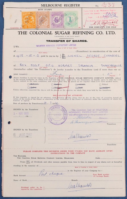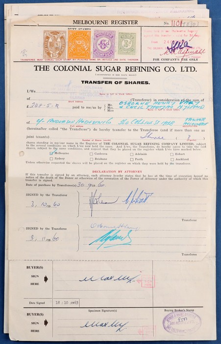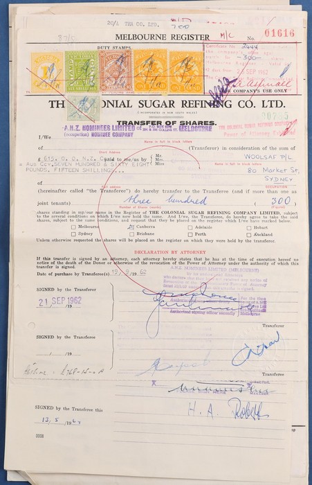3706 imageVictoria - Revenues: 1960s Colonial Sugar Refinery Co share transfer certificates with a range of vals from 9d pink single franking to £2 blue inc multiple frankings of up to 5 stamps. Approx 200 certificates inc a few with decimals attached or with 'Not Chargeable with Stamp Duty' cachets. (Image1) (Image2) (Image3) (Image4) (Image5) (Image6) (Image7) (Image8) (Image9) (Image10) (Image11) (Image12) (Image13) (Image14) (Image15) (Image16) (Image17) (Image18) (Image19)