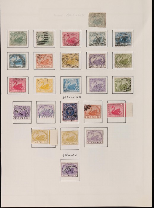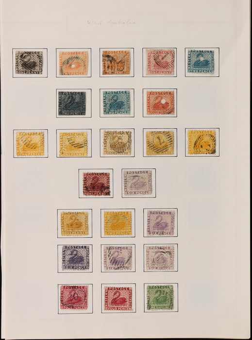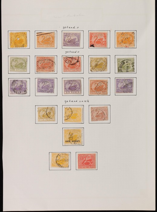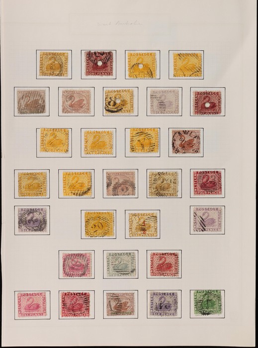 3707 imageWestern Australia 1854-1912 collection on pgs inc 1854 Swan 1d black, imperf. 1860-64 Swan 2d imperf. 1861 Swan 1d, 2d & 4d, perf. 1864-85 Swans to 1/- inc wmks & perfs. 1902-11 QV Swans to 2/6. Range of OS perfin ssues (officials), vals to 1/-. Mostly G-VF M/U, mixed condition in parts with several official punch holes, 90%+ being U. SG cat £1100+ = A$2200+. (124). (Image1) (Image2) (Image3) (Image4) (Image5)