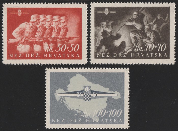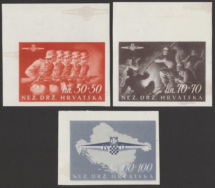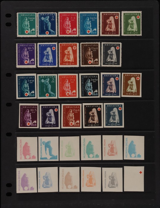 Legion in Russia set 1+0.50K - 9+4.50K PROOFS on 'carton paper', plus 1+0.50K w/o darker final print, all imperf horiz prs. VF UN. Mi 107-10UP(var), SG 85-88(p). rare, only 1 sheet of ea believed printed. 2008 & 2011 Zrinjscak AIEP photo certs. (5