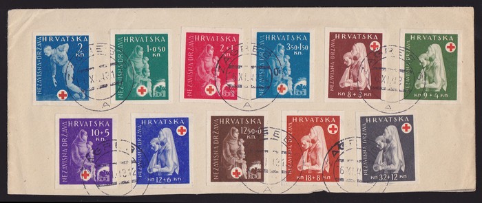 Cross set 1+0.50K - 32+12K, plus Charity Tax 2K, all IMPERF & tied to part cover by 'Zagreb 26x43' cds. VFU. SG 91-100a(var), Mi 118-27U & Z2U. Genuine U imperfs very rare, only several sets in existence. 2005 Wieneke BPP photo cert. (P) (Image1) (Image2)