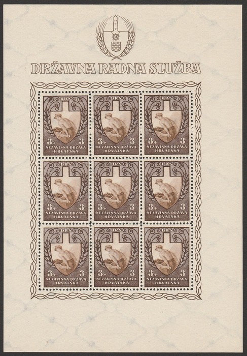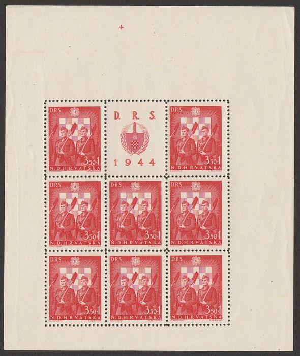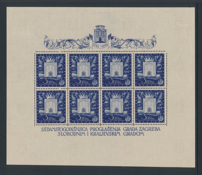 Zagreb Anniv 3.50K sheetlet of 8, 1944 Post & Rail Employees Relief set 7+3.50 - 32+165 sheetlets of 9, War Invalid Relief set 7-3.50K - 32+16K sheetlets of 8, plus central label. VF fresh MNH. Mi 97KLB & 150-57KLB cat €140. SG77 & 123-30 cat
