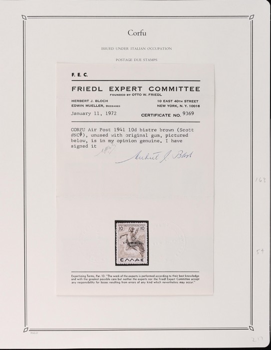 392 imageItalian Territories - Corfu: 1923 opts (11, SG cat £265), 1941 opts on Greece Postage Defs most values inc 10D (£700), 30D (£130) & 100D (£425), Airmail 50L-50D (£2672) inc 10D brown (1£300) -with Friedl photo cert, Charity set of 3 & Postage Dues (7). F?VF M/MNH. SG cat £4600 = A$9600. Very scarce issues. (38) (P) (Image1) (Image2) (Image3) (Image4) (Image5) (Image6)