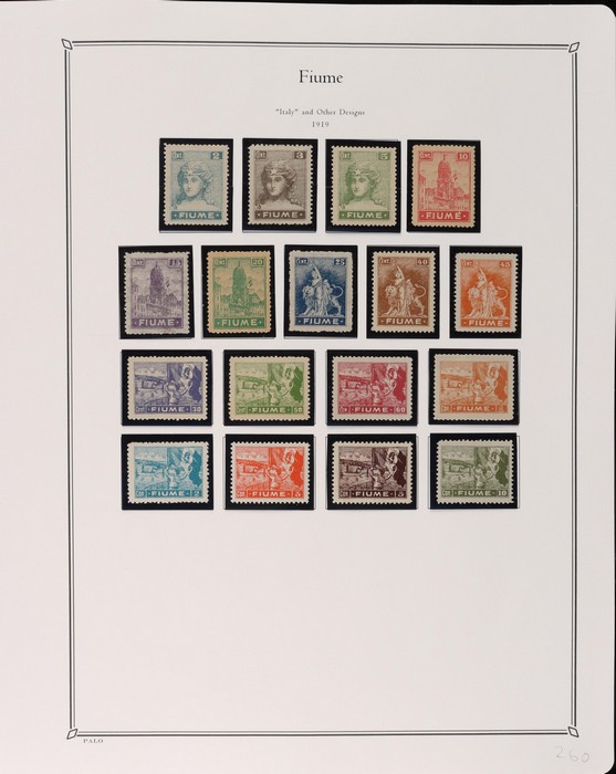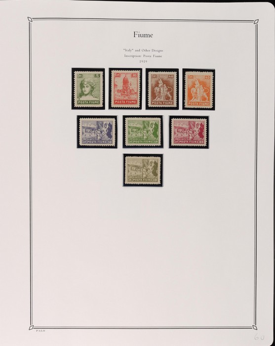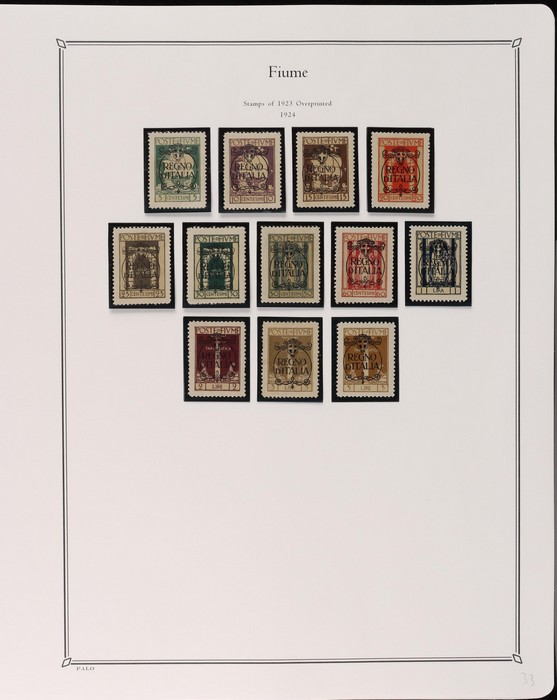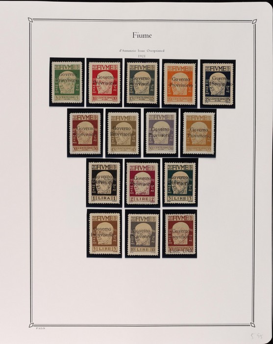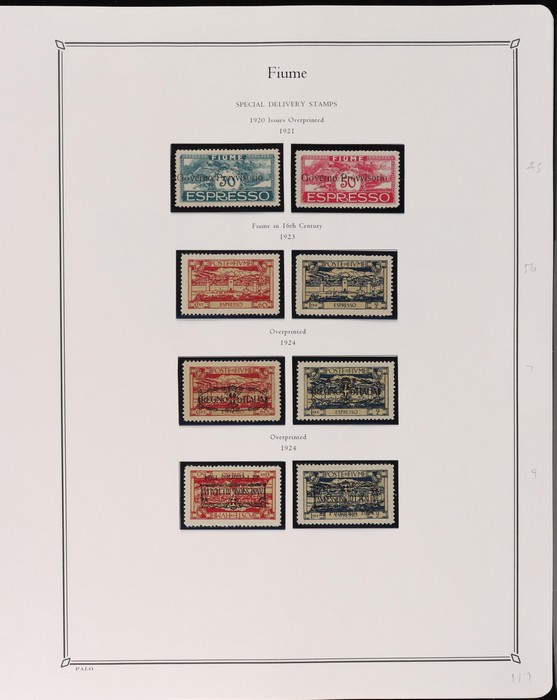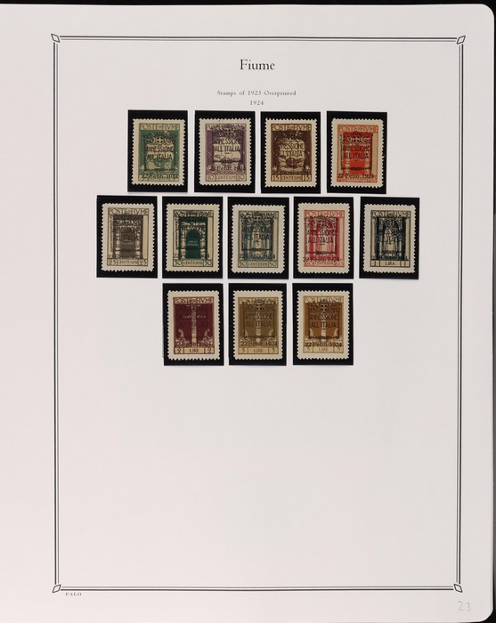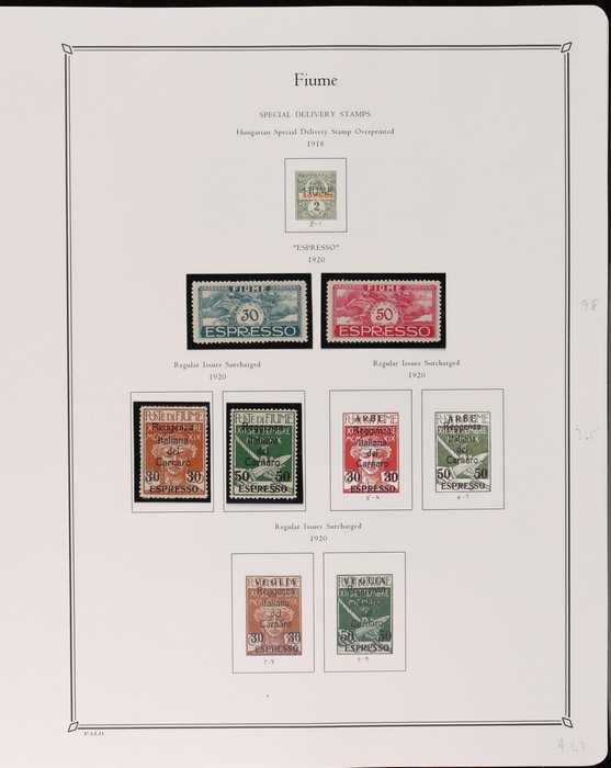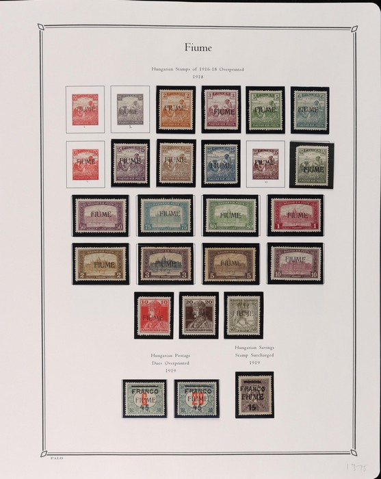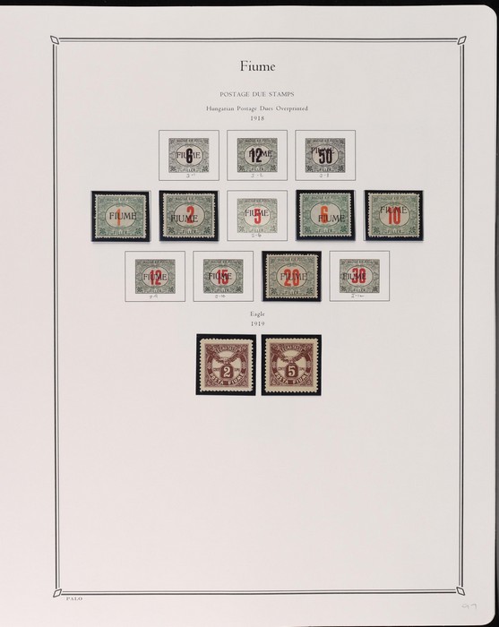 393 imageItaian Territories - Fiume: 1918?24 Mint collection in as new Marini hingeless album with opts on Hungary to 10Fr inc 7 Dues SG cat £1475, 1918 Def Picts set (£260) & ?Posta Fiume? set + Franco opts (12), Valore Globale basic opt set, & basic Student Fund set (£630) + 3 Express opts, 1920 d?Annunzio set (£200), Military Post set (£225), Carnaro opt set (£1695) inc 10L/25c (£800), & Express pr (£365). Arbe opts (6, inc 20c large opt (£700), Arbe opt & Veglia (4, £240), 1921 Prov Govt opt d?Annunzio set (£595), opt Assembly set (£600) inc 10L/25c (£800) -ex 30c, same opt ?1922?, 1923 Pict set (£210), 1924 Regno opt set & Annexation opt set -these also with Express, plus Postage Dues. F?VF M/MNH. SG cat £7470 = US$15,000. Valuable collection. (247) (P) (Image1) (Image2) (Image3) (Image4) (Image5) (Image6) (Image7) (Image8) (Image9) (Image10) (Image11) (Image12) (Image13) (Image14) (Image15) (Image16) (Image17) (Image18) (Image19) (Image20) (Image21) (Image22)