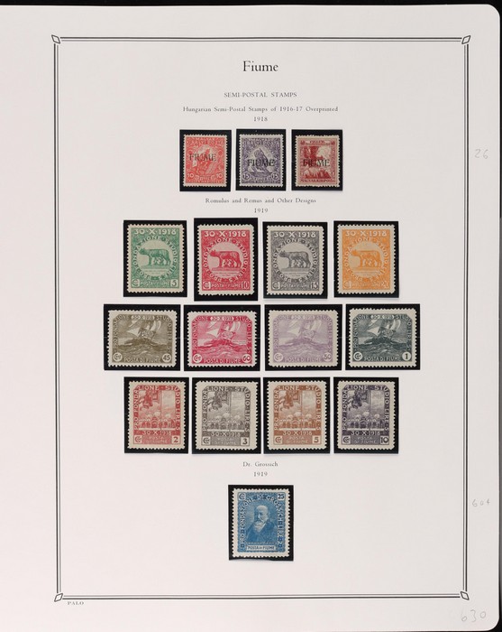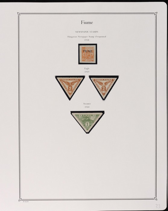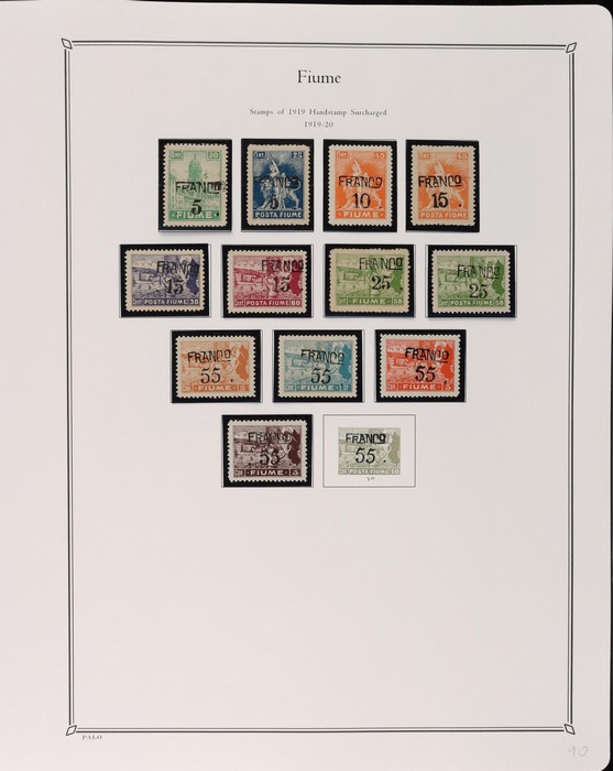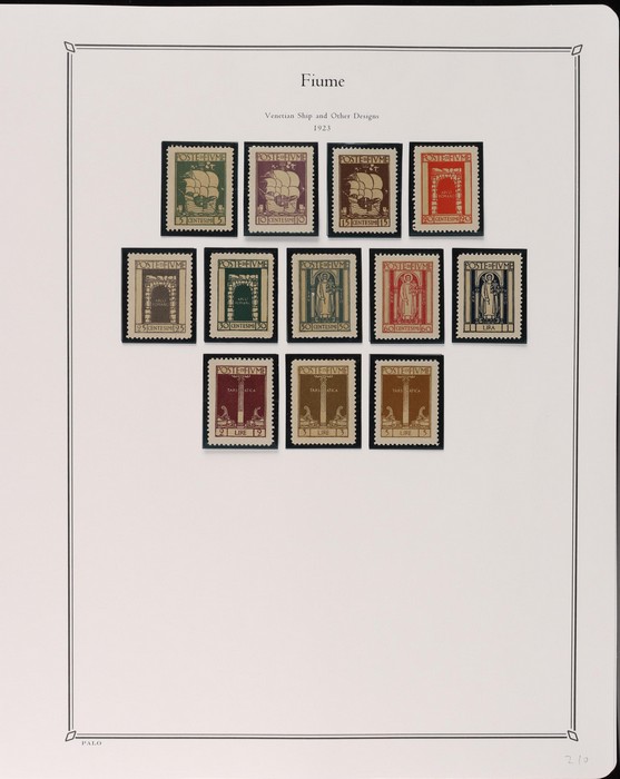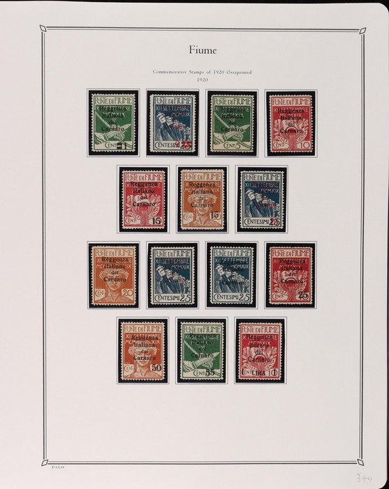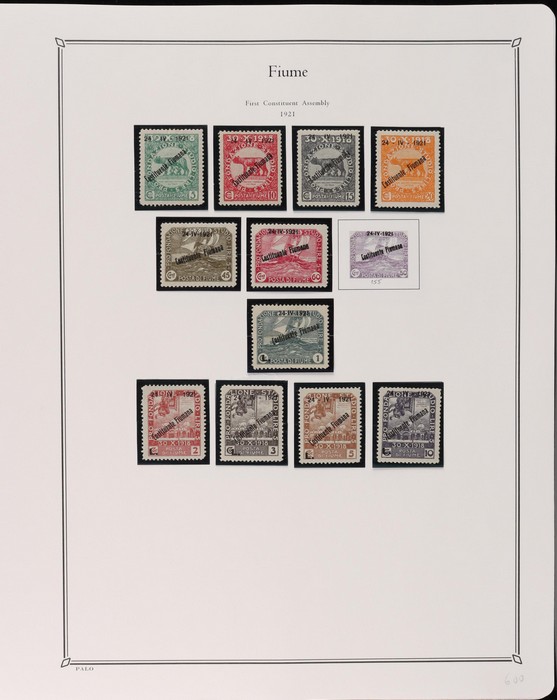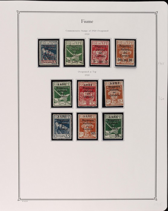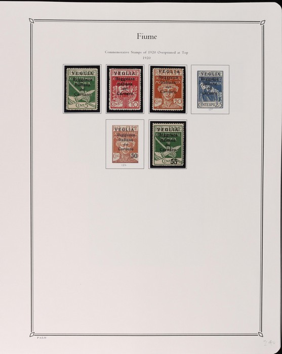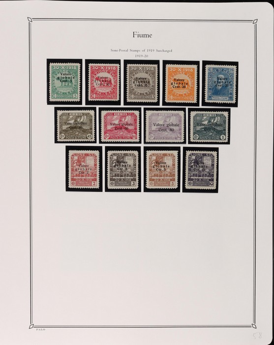 393 imageItaian Territories - Fiume: 1918?24 Mint collection in as new Marini hingeless album with opts on Hungary to 10Fr inc 7 Dues SG cat £1475, 1918 Def Picts set (£260) & ?Posta Fiume? set + Franco opts (12), Valore Globale basic opt set, & basic Student Fund set (£630) + 3 Express opts, 1920 d?Annunzio set (£200), Military Post set (£225), Carnaro opt set (£1695) inc 10L/25c (£800), & Express pr (£365). Arbe opts (6, inc 20c large opt (£700), Arbe opt & Veglia (4, £240), 1921 Prov Govt opt d?Annunzio set (£595), opt Assembly set (£600) inc 10L/25c (£800) -ex 30c, same opt ?1922?, 1923 Pict set (£210), 1924 Regno opt set & Annexation opt set -these also with Express, plus Postage Dues. F?VF M/MNH. SG cat £7470 = US$15,000. Valuable collection. (247) (P) (Image1) (Image2) (Image3) (Image4) (Image5) (Image6) (Image7) (Image8) (Image9) (Image10) (Image11) (Image12) (Image13) (Image14) (Image15) (Image16) (Image17) (Image18) (Image19) (Image20) (Image21) (Image22)