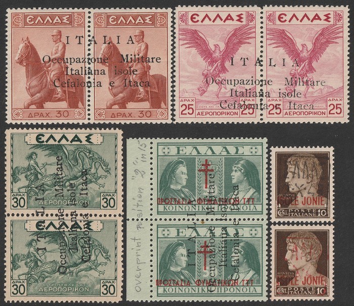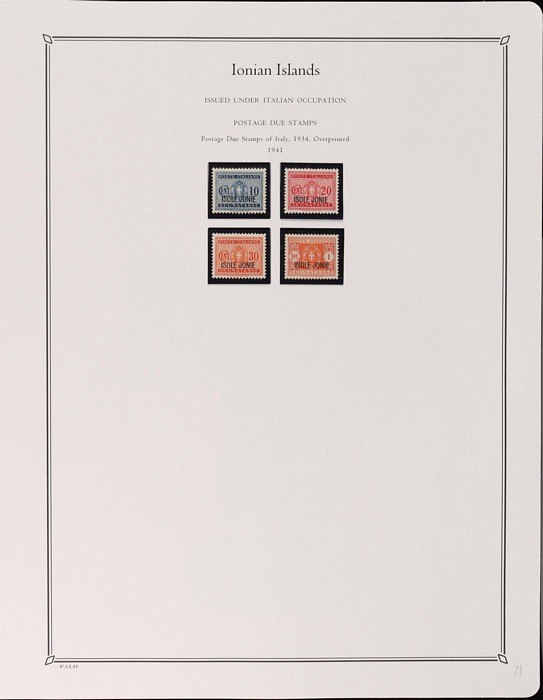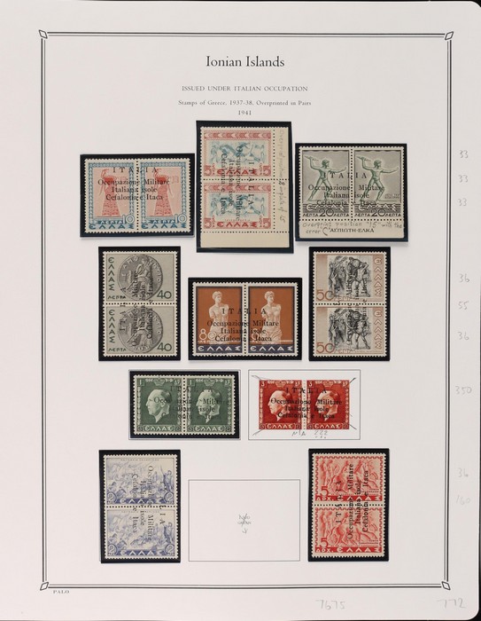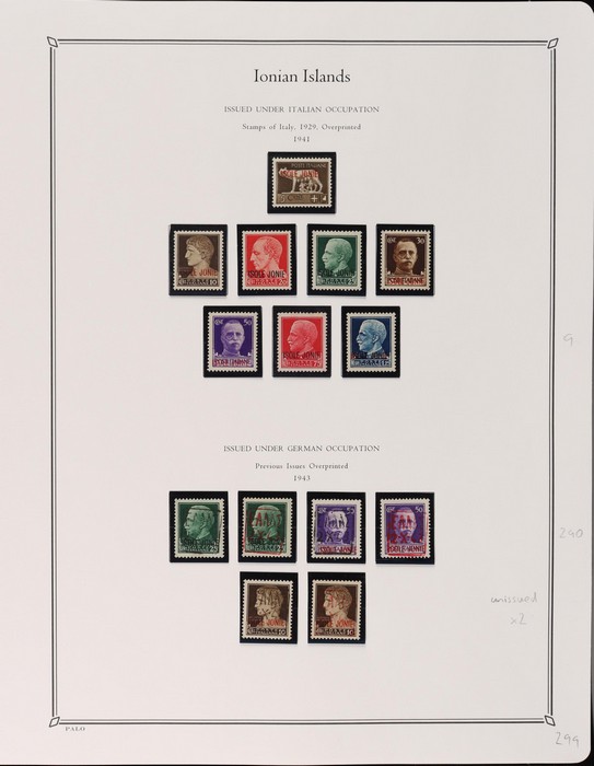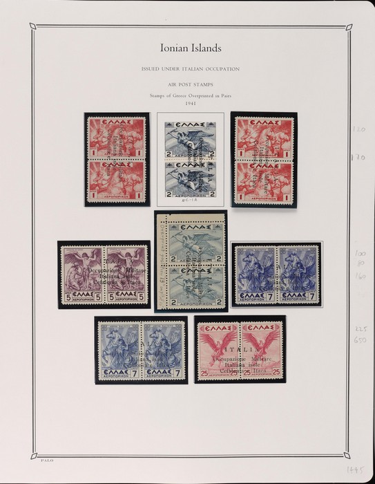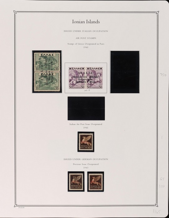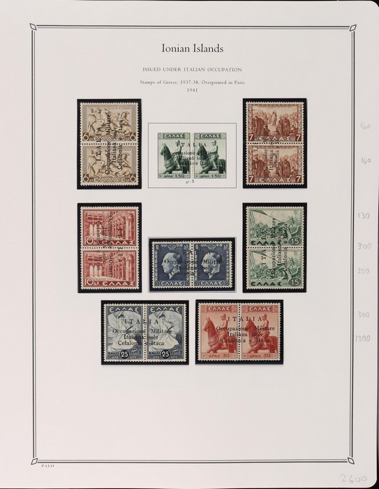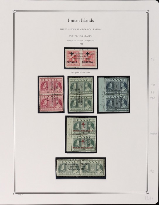 394 imageItalian Territories - Ionian Islands: 1859?1941 Mint collection on pages with 1859 QV 1d red (SG cat £70), 1941 Italian Occup ?Isole Jonie? opts set of 13, 1943 German Occup comp (6) with black & red opt plus Biondi photo cert for all 8! Then Cephalonia & Ithaca opt prs inc unissued 10c, reading up or down, diff papers, Charity, Airmails etc (£5567) inc 10c green (£350), 30D (£1300), Airmail 25D (£650), 30D green (£750), & Charity 50L with extra Red Cross opt (£1000). F-VF M/MNH. SG cat £7675 = A$16,000. Valuable collection(24 + 30 prs) (Image1) (Image2) (Image3) (Image4) (Image5) (Image6) (Image7) (Image8) (Image9) (Image10) (Image11)