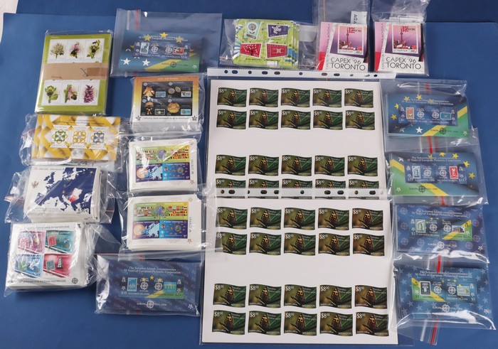 501 imageWorld M/sheets modern 2000s stock with Romania CAPEX 96 (200, Mi cat €600), Portugal 2003 Orchids (100, €900), Bosnia-Herzegovina 2006 Europa (200, €2000), Cyprus 2006 Europa (100, €500), Jamaica Europa 2006 (100, €900), Montenegro Europa 2006 imperf (200, €4000) & Map of Europe (250, €5000), Peru Europa 2006 (250, €1750). Total 1400 M/S, Mi cat €14,840 = A$24,600. Also Solomon Is 2006 Europa set of 6 M/sheets (approx 100 of ea) FV $7100 = A$1300, plus Tonga-Niuafu'ou 2012 Butterfly set of 12 to $8.00 both imperf & perf, 20 set in comp sheets. FV T$1860 = A$1200. All fresh MNH, total FV & cat A$27,400. (1400 M/S, plus extras) (Image1)