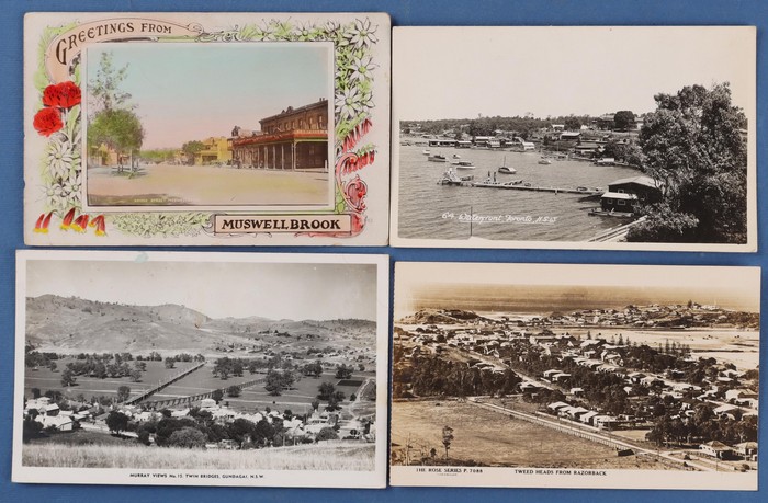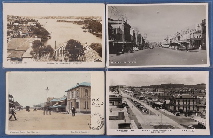 535 imageAustralia - NSW: Concise early 1900s collection with 18 diff Banks inc Brewarra, Coonamble, Inverell, Kempsey, Moree, Parkes, Temora & Walcha. Other cards of interest inc A Broken Hill Dust Storm. Then Street Scenes from Circular Quay, Cootamundra, East Maitland, Glen Innes, Goulburn, Musellbrook & Church Street Parramatta., plus Country Scenes, Provinvial Towns inc Gundagai, Thirroul, Tweed Heads, Wollongong & others inc Kiandra Chalet Hotel near Lake Encumbene, Nielsen Park Sydney Harbour & Panorama from Cremorne Heights. Mixed UN/U, mostly F-VF condition. (110) (Image1) (Image2) (Image3) (Image4) (Image5) (Image6) (Image7)