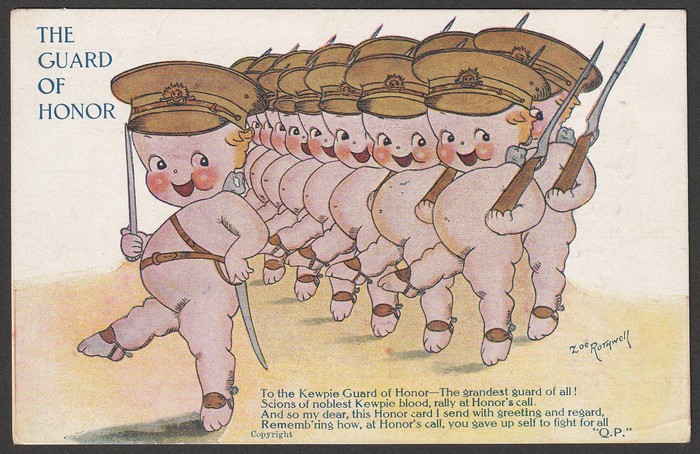 542 imageAustralian Artist: Zoe Rothwell WWI Humour set of 3 with 'Come On' (Artillery), 'Isn't it great to be happily married?' & 'The guard of honour'. VFU. RRR. (3) (P) (Image1) (Image2) (Image3)