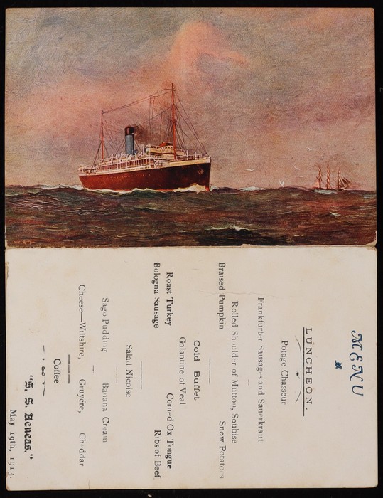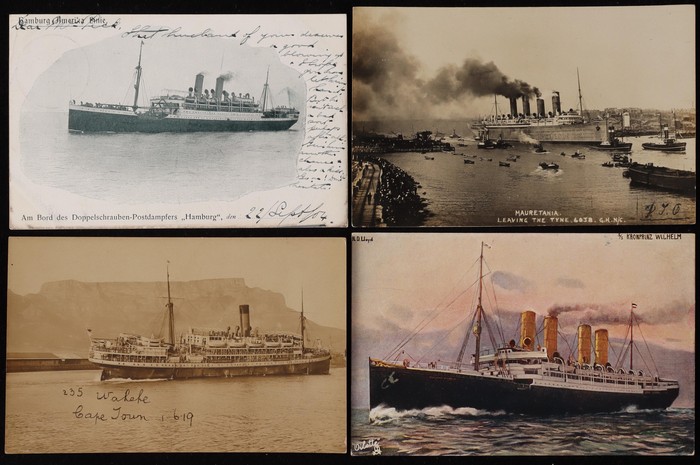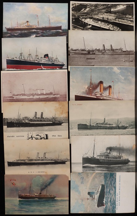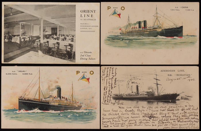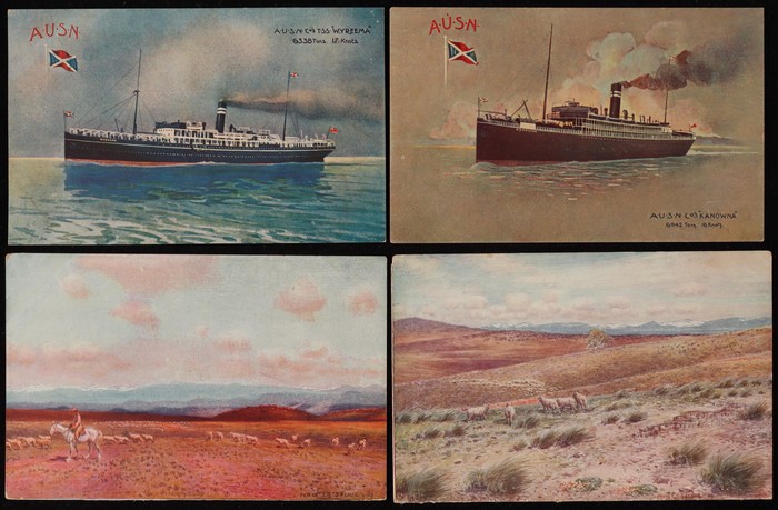 550 imageAustralia - Ships & Shipping collection early period on with A.U.S.N. group (7) inc Arawatta, Bingers, Wodonga & Wyandra. Blue Funnell Line Advertising cards (3) with Artists cards Lights of Sydney, Snowy Mountains (both with 1913 menus attached), Kosciusko (menu excised), Brisbane Tug & Steamship Co TSS Koopa, Orient Line SS Otran to 2nd Class Dining Saloon. Then another 19 cards inc P&O SS Delhi & SS China, Aberdeen Line SS Moravian & Hamburg-Amerika Linie Hamburg. Mixed UN/U, mostly F-VF condition. (31) (Image1) (Image2) (Image3) (Image4) (Image5) (Image6) (Image7) (Image8)