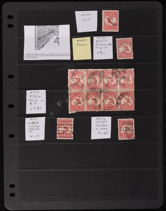collection, wmk INVERTED dies, major varieties inc 7 'flaw west of Tasmania', 'extra island - 2 Tasmanias' (2), perf OS NSW (1), range of Die IIA other varieties. Mostly G-VFU. SG 2(var). ACSC cat $1200+. Ex Sandy. (47) (Image1) (Image2)