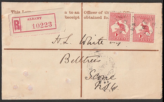 6 on 'Registered Packet Post' parcel front 'Registered Sydney 2 JA 13' cds of FIRST DAY OF ISSUE, to famous philatelist H.L.White at Scone. SG 2(var). ACSC 2Ay cat $15,000+. Important rarity of the Kangaroo issues as only total of 11 FDC recorded &