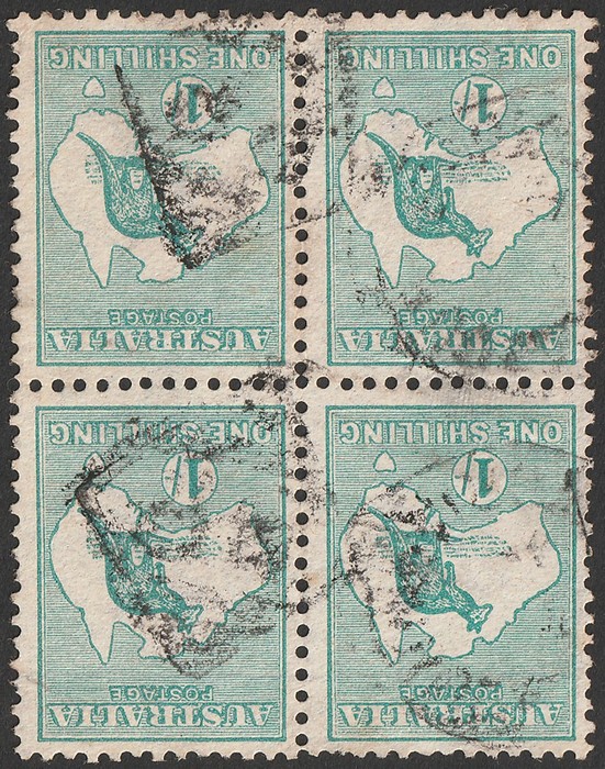 wmk INVERTED blk of 4. Postally G-FU. SG11w cat £320 = A$640 (for CTO). ACSC 30Da cat $1600 for common shade, pale blue-green is much scarcer & should be at least double, $3200. Very rare multiple commercially used. Ex Sandy. (4). (P) (Image1)