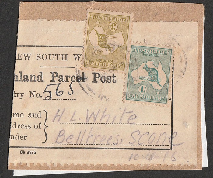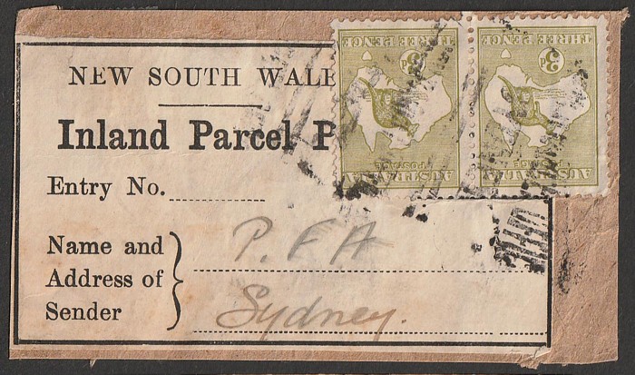 Die I & NSW 8d Lyrebird on parcel piece, tied 'registration Sydney 18 AU 13' cds. G-FU. SG 2,11(var). ACSC 30B cat $60 as loose stamps & $1250 on cover. Scarce usage with NSW 8d Lyrebird. Ex Sandy. (3). (P) (Image1)