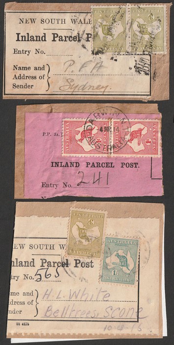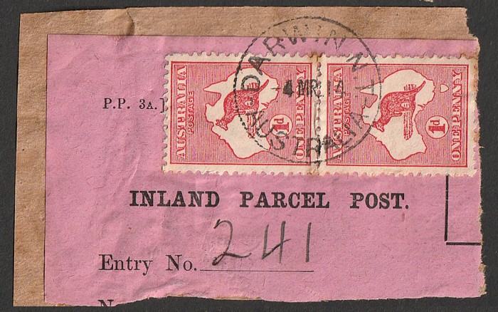 Olive green, 3d Olive green pr green 'Inland Parcel Post' pieces & 1d red die II pr on piece with superb Darwin NT 4MR 14 cds. G-FU. ACSC 3, 12 & 30 cat $140+++ as loose stamps, cat $2000+ on cover. Scarce usage. Ex Sandy. (3). (Image1) (Image2)
