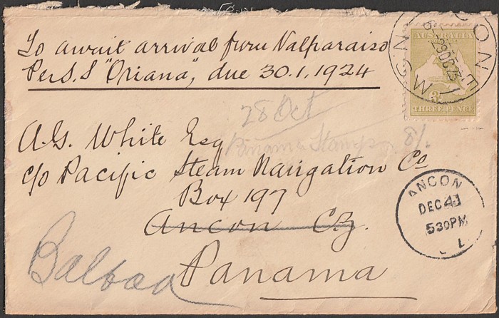 IIB, on cover tied 'Scone 29 OC 23' cds, sent to Panama to be held for arrival of SS Oriana Due 30-1-24' F-VFU. SG 37c. ACSC 14c cat $250+++. Very interesting cover to rare destination. Ex Sandy. (P) (Image1) (Image2)