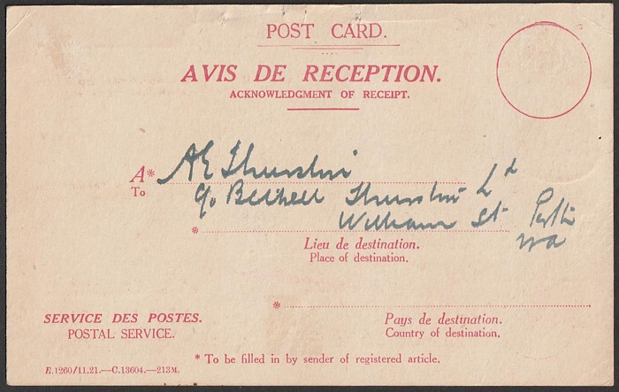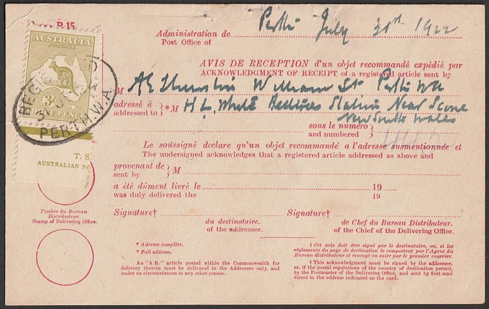 IIB, Perth on 'Acknowledgement of Receipt of Registered article' tied 'Registered Perth 31 JY 24 cds' sent to Prominent Philatelist H.L.White. SG 37c(var). ACSC 14C cat $250+++. Rare item. Ex Sandy. (P) (Image1) (Image2)