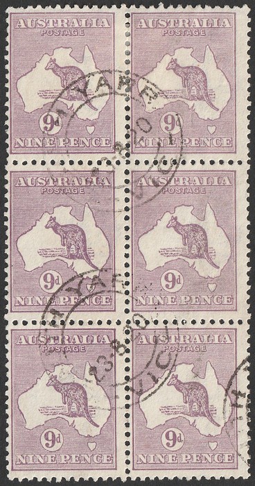 IIB, blk of 6. FU. Fine SOUTH YARRA 23-8-20 cds. SG 39b cat £132 = A$264. ACSC 27B cat $120 as single. Scarce multiple. Ex Sandy. (6) (Image1)
