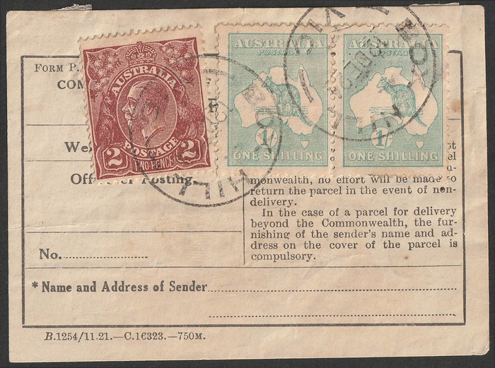 pr with 2d brown KGV single wmk on parcel label, pmk Box Hill, VIC 12 DE 24. Overall VF. SG 40(var). ACSC 33A/97A cat $400+. Ex Sandy. (P) (Image1)