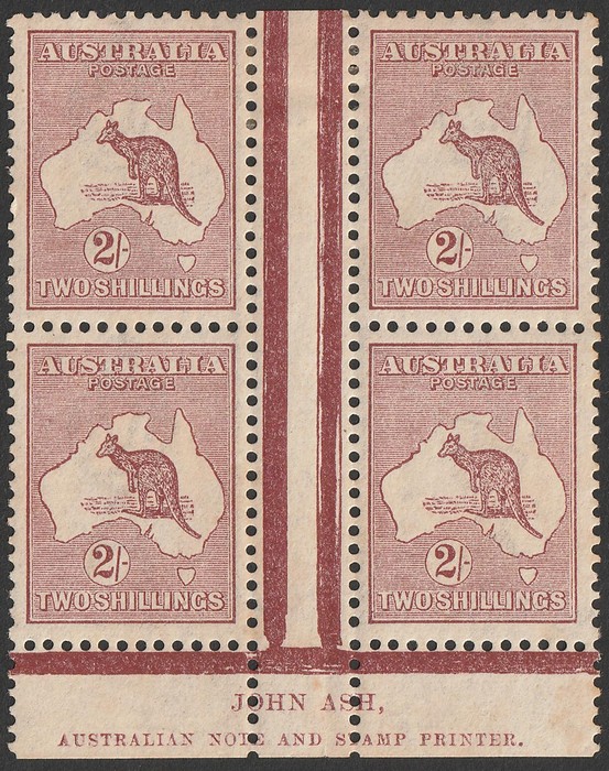 imprint blk of 4, plate 2. VF appearance 2 MLH / 2 MNH, gum rather tropicalised. SG 74(var). ACSC 38A(2)zd cat $3250. Ex Sandy. (4) (P) (Image1)