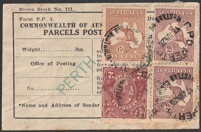 chestnut Kangaroos & 2d red brown KGV, single wmk on a parcel label pmk Perth 17 JU 26 (total 4/- 8d). F-VF, minor tropicalisation. SG 74 (var) ACSC 38 etc cat $500+. Ex Sandy. (4). (P) (Image1)