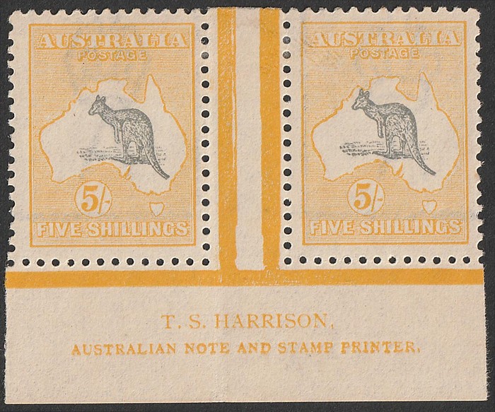 pale-yellow, Harrison imprint pr with variety 'white flaw off NSW coast' (R55). VF MLH, W/C, sl uneven gum colour. SG 42e(var). ACSC 44Dze cat $3500. Ex Sandy. (2) (P)