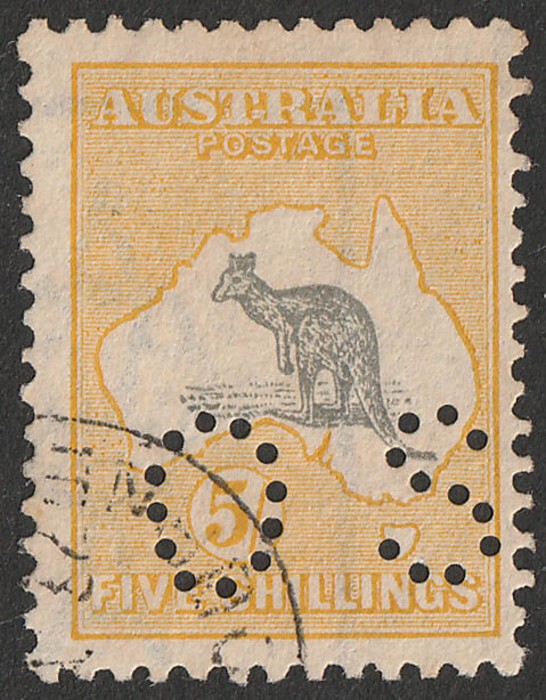 OS, variety 'long curved tail to kangaroo', centred Low & wmk line & partial crown centred to right. F-VF CTO. SG O050. ACSC 44D(V)P cat $450. (P) (Image1)