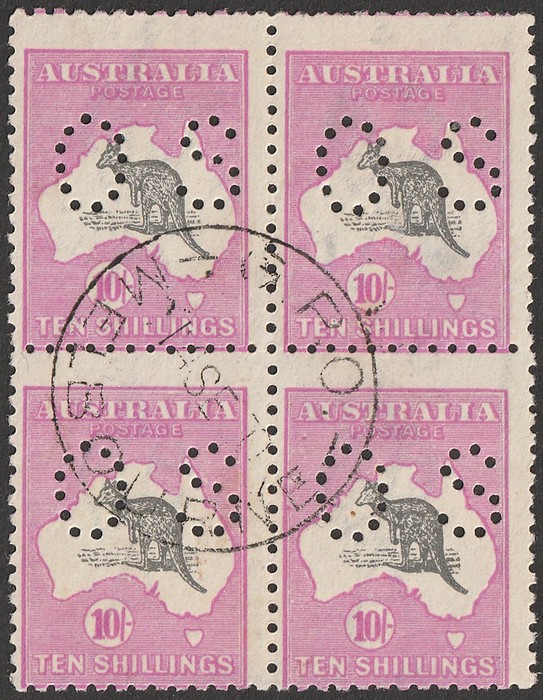 aniline pink perf OS, CTO with gum, W/C. VFU. SG O51 cat £110. ACSC 48Eba cat $500. (P) (Image1)