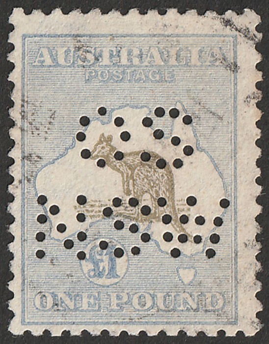 pale blue perf OS/NSW. FU. SG 44 £1600 as normal, SG O52 cat £6500 as perf OS. ACSC 52E cat $4500 as normal, 52Eb perf OS cat $12,500. Very rare official perfin especially as this rare shade. Ex Sandy. 2025 Ceremuga AIEP photo cert. (P) (Image1)