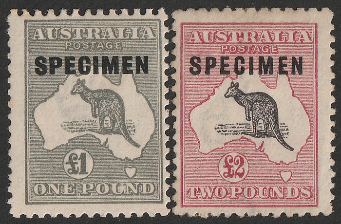 £2 purple-black & rose opt SPECIMEN, type D & C. F-VF MLH, part gum. SG 45bs & 75s. ACSC 53Bxb & 56Cxb cat $875. Ex Sandy. (2) (P) (Image1)