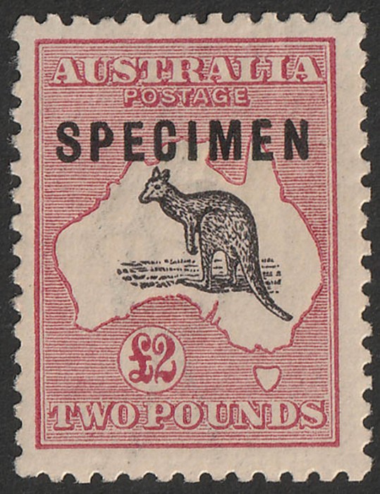 & crimson, opt SPECIMEN type B. VF MLH, gum sl darker. SG 45a(var) cat £4750 for normal. ACSC 56Bx cat $600. Ex Sandy. (P) (Image1)