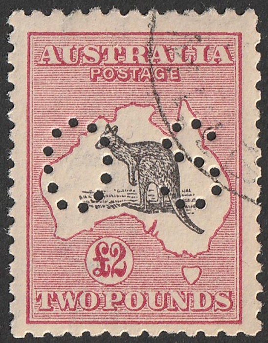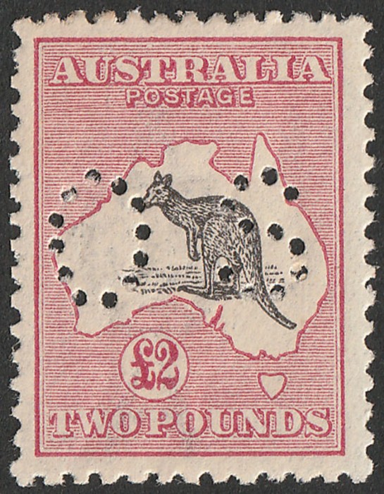 & rose, perf OS. VF fresh CTO with Melbourne cds (with gum), nice colours. SG O53 cat £4500. ACSC 56Cwa cat $4750. Rare perf OS top value. 2025 Ceremuga AIEP photo cert. (P)