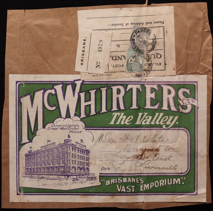 Brisbane pictorial mail order wrapper franked Kangaroos 6d blue & 1/- 3rd wmk (1/- flts) 17 Dec 1917 with Brisbane Parcel number label 4979 with scarce 'Parcel Post Brisbane' cds, to Townsville. This is a very rare survivor & although the wrapper has