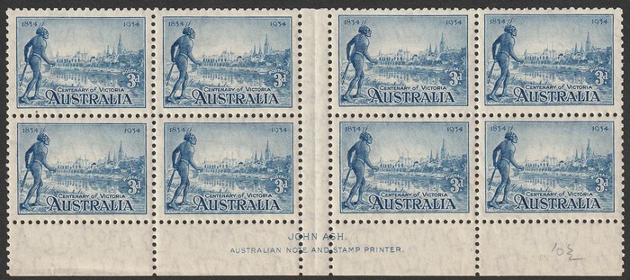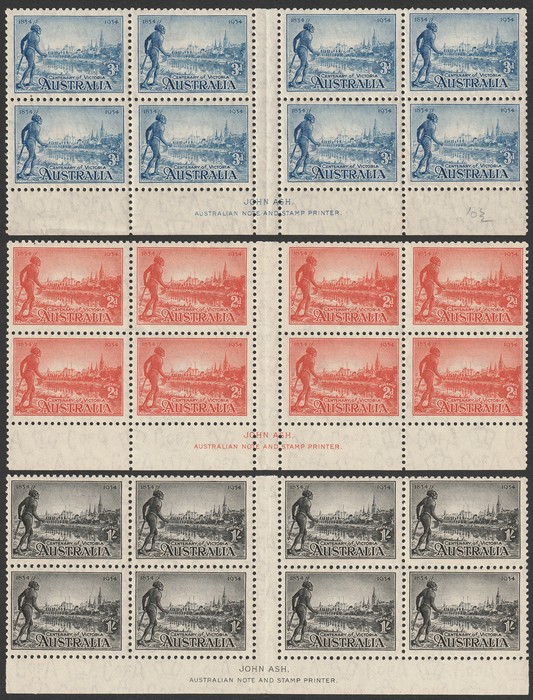 Centenary 2d, 3d, 1/- set perf 10½, Ash imprint blks of 8. Superb MNH. SG 147-149(var). ACSC 151-53 cat $1500 with extra stamps. (24). (P) (Image1) (Image2)