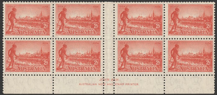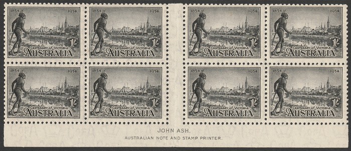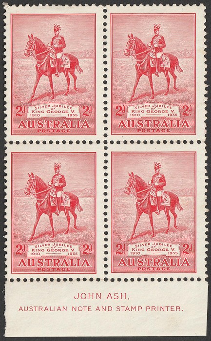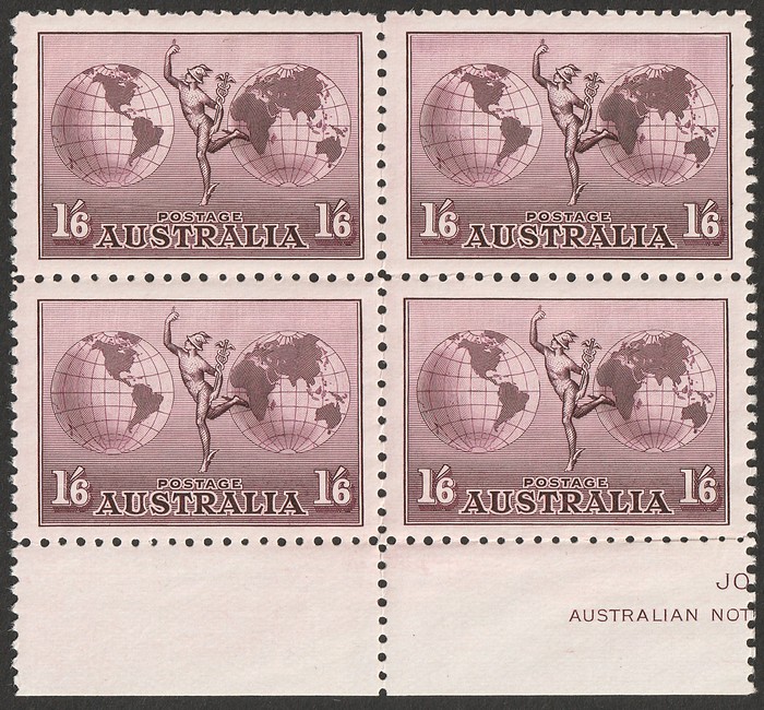 Hermes no wmk, perf 11, part Ash imprint blk of 4. VF fresh MNH. SG 153 cat £180 as 4 M singles, should be at least double, £360 MNH. ACSC 161 cat $500. (4) (P)