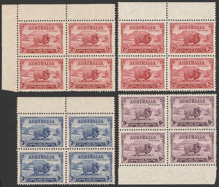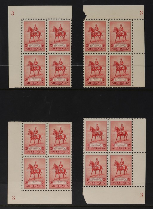 Centenary set 2d, 3d, 1/- Ash imprint blks of 4. 2d perf 11½, 3d perf 10½ MLH/MNH, 1/- perf 10½ W/C MNH. SG 149-151. ACSC cat $850. (P) (Image1)