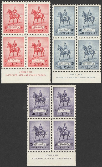 Jubilee set 2d, 3d, 2/- imprint blks of 4. Superb MNH. SG 156-58(var). ACSC 166-68zb cat $785. (12). (P) (Image1)