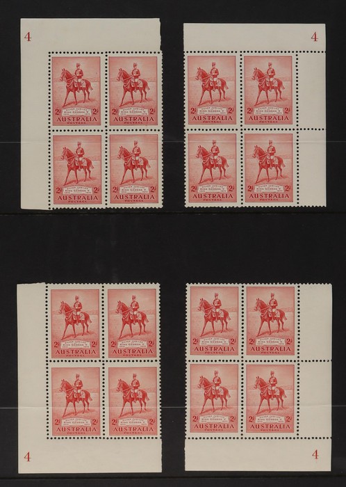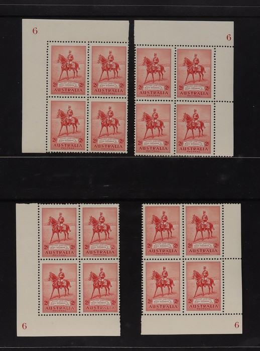 red brown Ash imprint blks of 4, plated 1 & 2. 1st VF MLH/2MNH & 2nd VF MNH. SG 146(var) £160 for M singles, should be at least double, £320 for these. ACSC 160z & 160za cat $450. (8). (P) (Image1)
