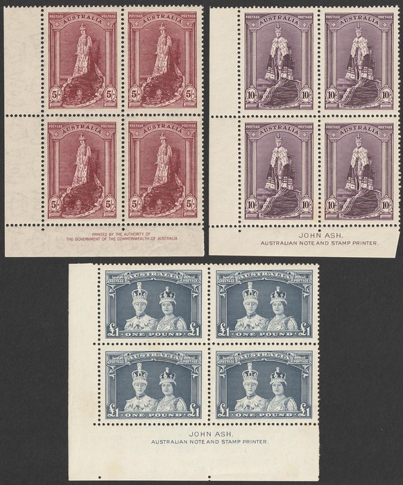 5/- thin paper Authority imprint blk of 4 MNH. 10/- & £1 thick paper Ash imprint blks of 4. Minor tones spot effecting two 10/- stamps, 2M/2MNH. SG 176a-78 cat £650. ACSC 213za, 214z, 216z cat $925. (P) (Image1)