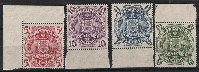 10/- & £1 thick paper Ash imprint LL cnr imprint blks of 4. VF fresh MNH, W/C. SG 176-78 cat £600++ as singles. ACSC 212-216z cat $1325. (12) (P) (Image1)