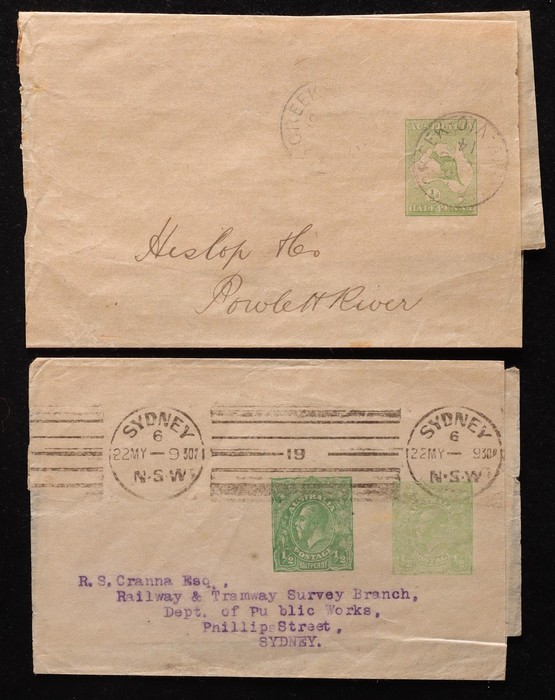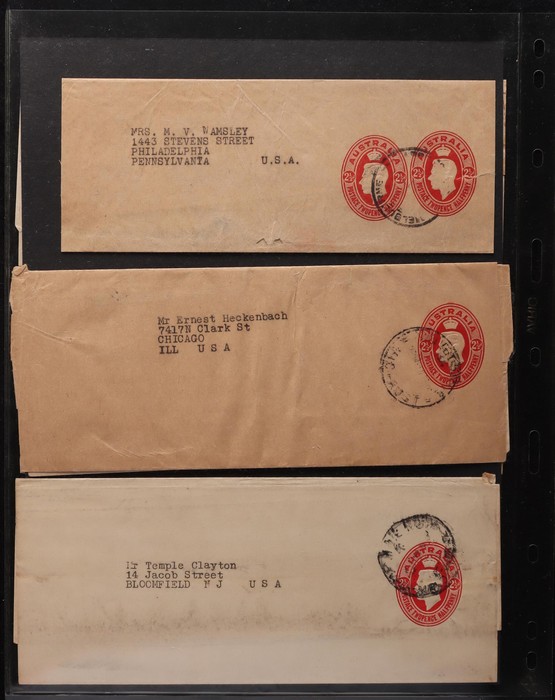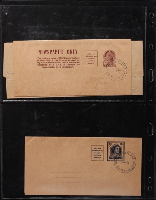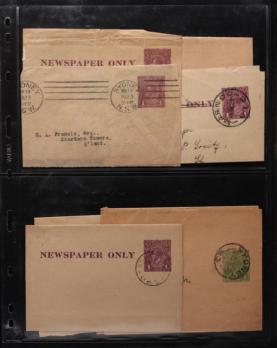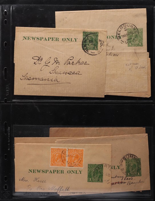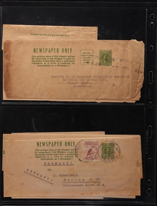 1465 imageWrappers: 1913-70s collection with 1913 Kangaroo ½d green (4, ACSC cat $300), KGV ½d green (4, $160), ½d+½d green (2, $150), 1d red (2, $150), 1d violet (4, $135) inc CTO & front only PTPO w/o 'Newspaper Only', 1d green w/o text PTPO (2, $400), then PO type 1d green (8, $170), 1927 extra text Die I & Die III ($80), 1931 with stamp box (4, $52), 1938 Queen 1d (2, $60) inc uprated to Germany, KGVI 1½d ($200), 1942 new stamp (9, inc large PTPO 1½d Official $290), 1947 PTPO oval 2½d red (8, $800) & Doubleton 2½d+2½d (3, $225). 1953 QEII 2½d brown CTO, 5d blue & red ($50) etc. Also 1949 1½d+1½d green Doubleton front only, QEII PTPO 5d light blue front & 5d dark blue PTPO ($200). Mostly VFU, about 10 fronts only. ACSC cat $3450, plus the fronts. A stunning collection. (65) (Image1) (Image2) (Image3) (Image4) (Image5) (Image6) (Image7) (Image8) (Image9) (Image10) (Image11) (Image12) (Image13) (Image14) (Image15) (Image16) (Image17) (Image18) (Image19) (Image20) (Image21) (Image22) (Image23)